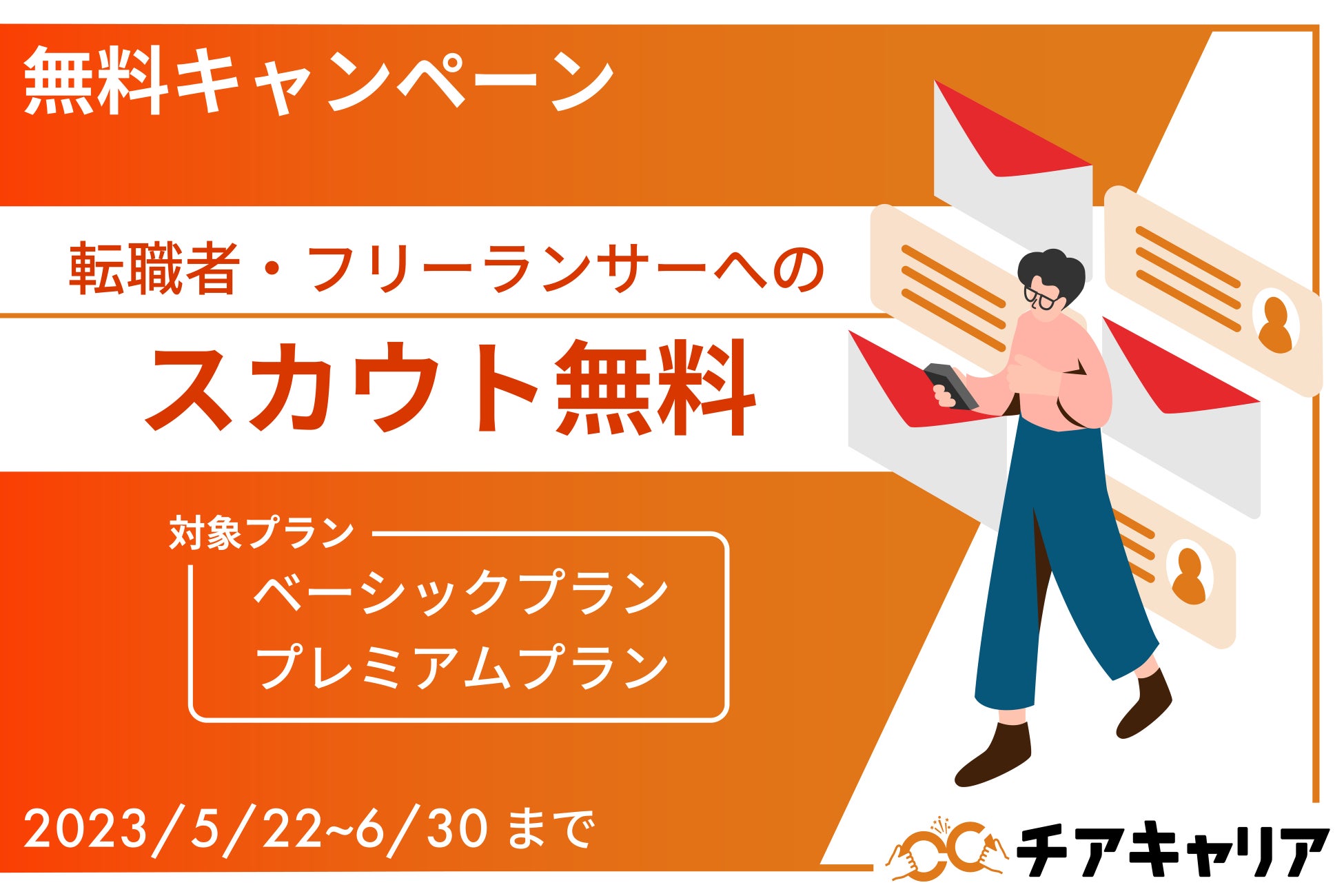 自社運営の成長企業向け就活サイト「CheerCareer(チアキャリア)」において、転職者、フリーランサーへのスカウト機能をベーシックプラン・プレミアム有料プランを利用する企業様を対象に、期間限定で100通まで無料で提供させていただきます。