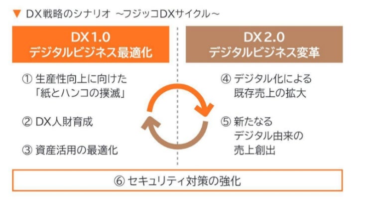 DX戦略のシナリオとして、DX1.0とDX2.0を循環させる「フジッコDXサイクル」を策定しました。また、6つのデジタル共通価値指標(①生産性向上に向けた「紙とハンコの撲滅」、②DX人財育成、③資産活用の最適化、④デジタル化による既存売上の拡大、⑤新たなるデジタル由来の売上創出、⑥セキュリティ対策の強化)を定め、企業価値の向上を目指します。