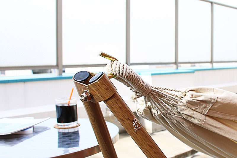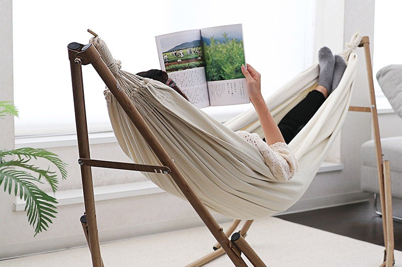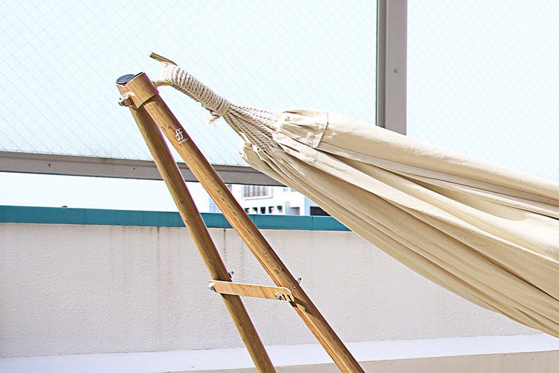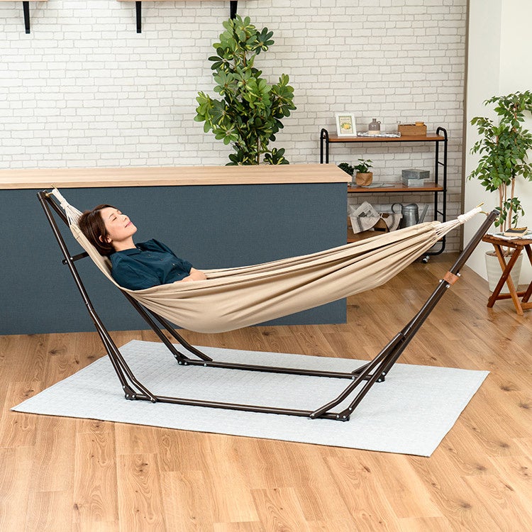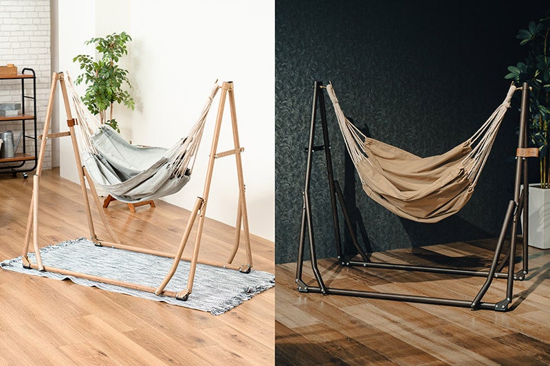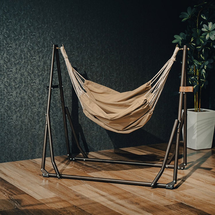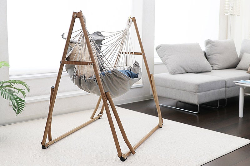 お部屋によく馴染む美しいウッド調のスタンドがポイントのハンモックセットは、アウトドアはもちろんおうちでのリラックスタイムに、さらにインテリアとしても十分楽しめます。