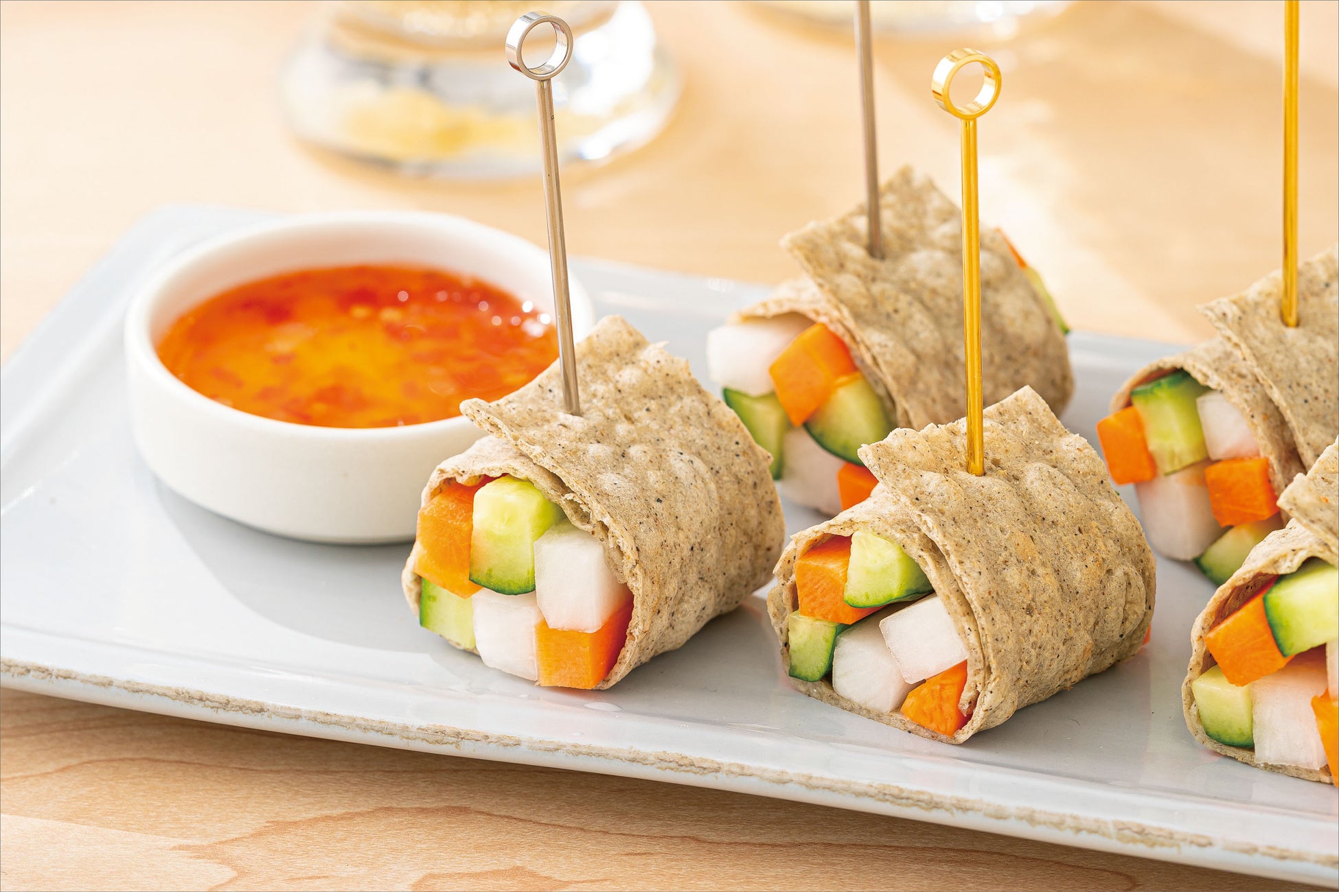 ②スティック状にカットした大根、きゅうり、にんじんを『魚で毎日カルシウム』で巻き、崩れないようピックなどで固定する。