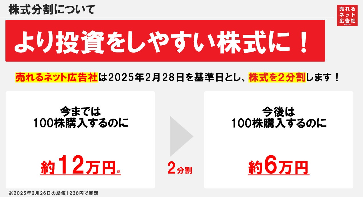 売れるネット広告社グループ株式会社(本社:福岡県福岡市、代表取締役社長CEO:加藤公一レオ、東証グロース市場:証券コード9235、以下 売れるネット広告社)は、2024年12月16日に開示しました「株式分割及び株主優待制度の変更に関するお知らせ」記載のとおり、2025年2月28日(金曜日)を基準日とし、同日最終の株主名簿に記録された株主の所有する普通株式を1株につき、2株の割合をもって分割をいたします。本日売買分から株価が変わっておりますので改めてお知らせさせて頂きます。