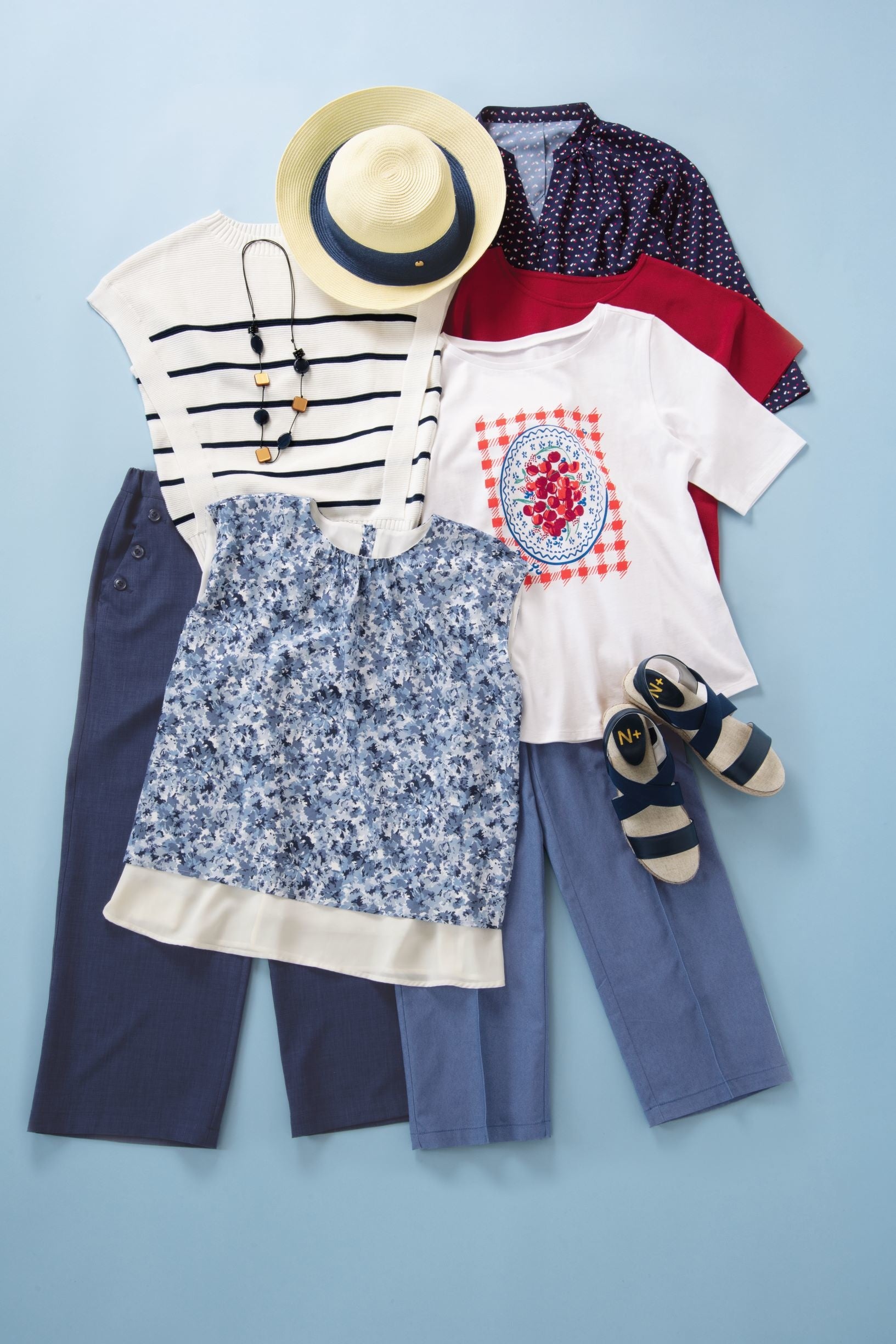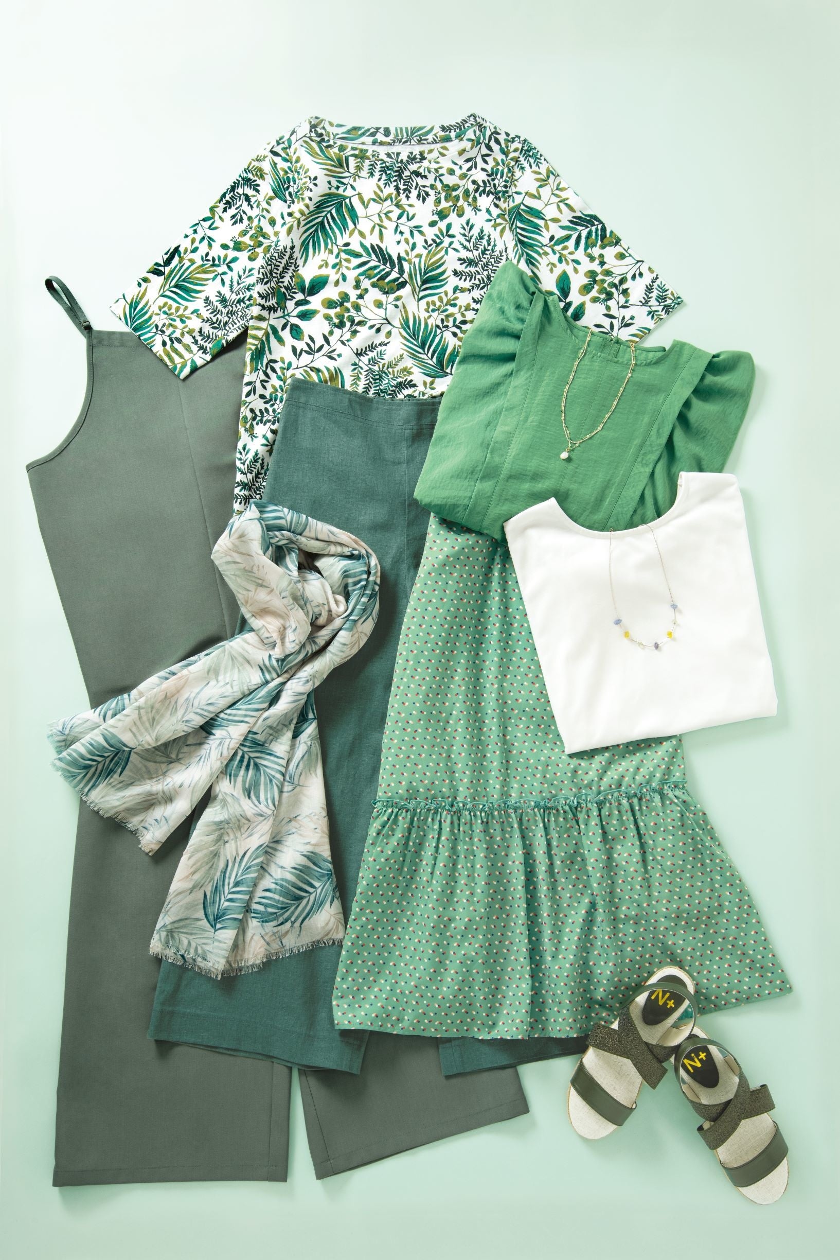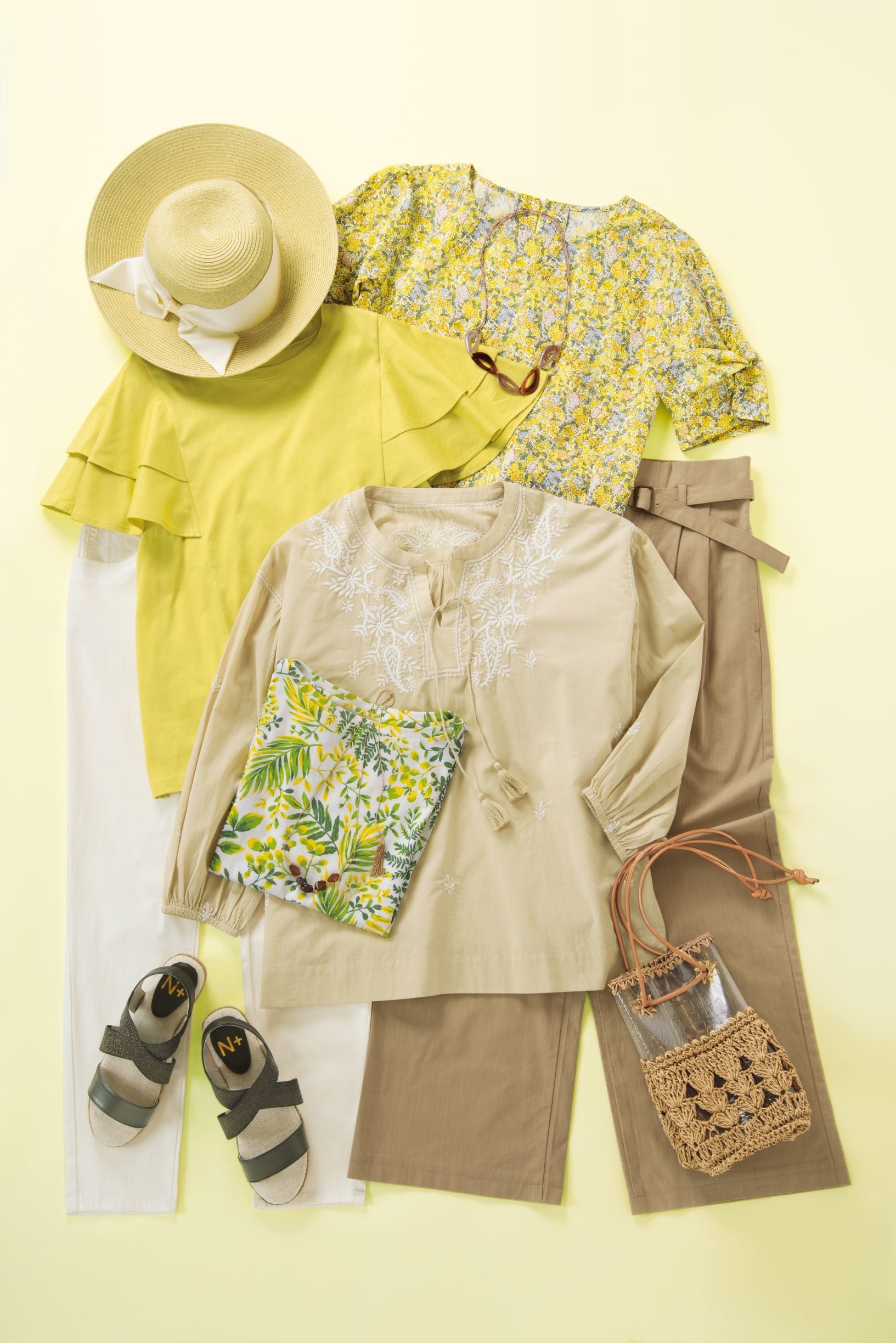 今夏のN+では、爽やかな夏にぴったりなグリーン、ブルー、ピンク、モノトーン、イエローの5色で、色と柄がつながるコーディネートをご提案します。帽子やサンダル、アクセサリーにも新作が登場し、全身をおしゃれにトータルコーディネートができる1冊です。