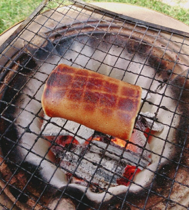 七輪でこんがり焼くと、外はサクサク、中はもちもち、ふわふわにさらに中のブラックサンダーもザクザク、トロ~リの食感を味わうことができます。