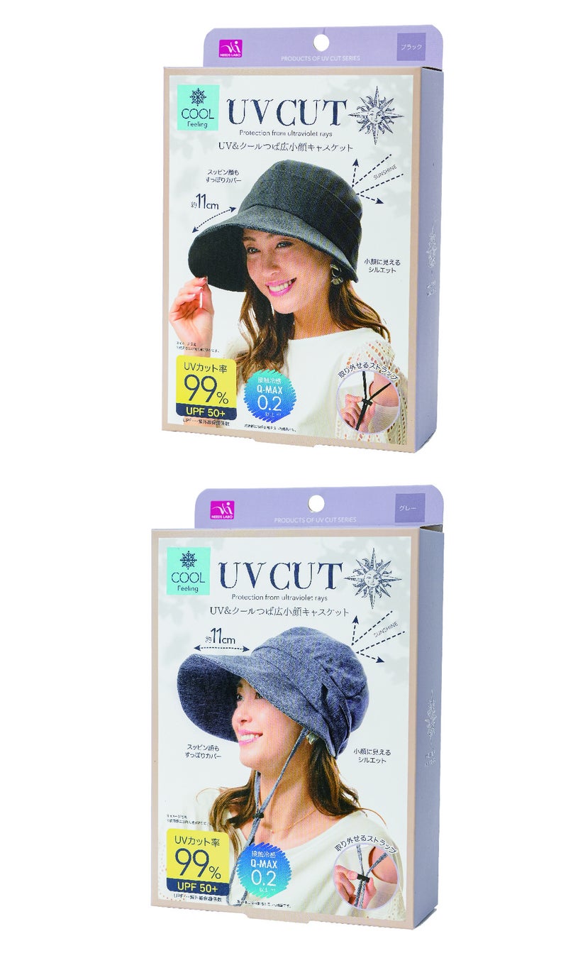 「UV&クールつば広小顔キャスケット」は、UVカット率が99%/UPF50+と高い紫外線カット効果があります。大きめのつばと頭をすっぽり覆うデザインで、小顔効果を演出してくれます。