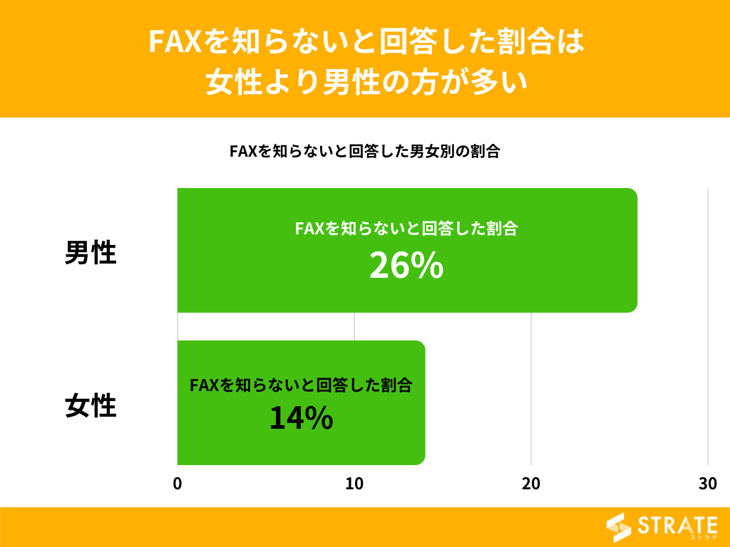 FAXを知らないと回答した割合を男女別でみてみますと、男性が26%に対し、女性は14%にとどまりました。