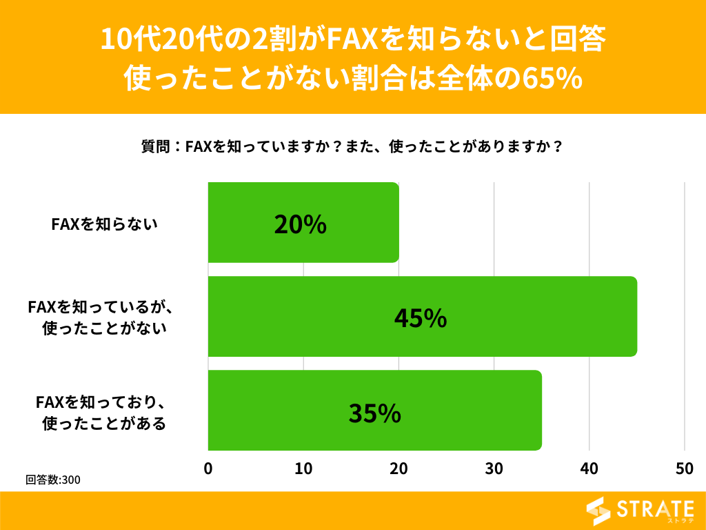 10代〜20代の男女を対象とした「FAXを知っていますか?また、使ったことがありますか?」というアンケートで最も多かった回答は「FAXを知っているが、使ったことがない」で45%でした。