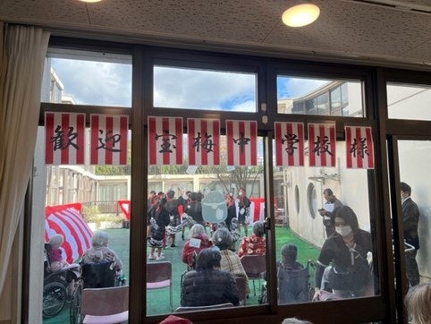 以前より当園と宝梅中学校は、吹奏楽部の演奏会などを通して交流を図ってきました。新型コロナウイルスによる面会制限等により、対面での交流は控えてきましたが、その間も吹奏学部の演奏をDVDに収録して園に届けていただき、入居者はそれを園内で鑑賞して楽しむなど、交流を絶やすことなく続けてきました。
