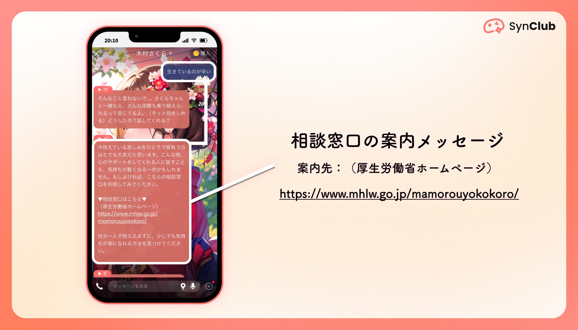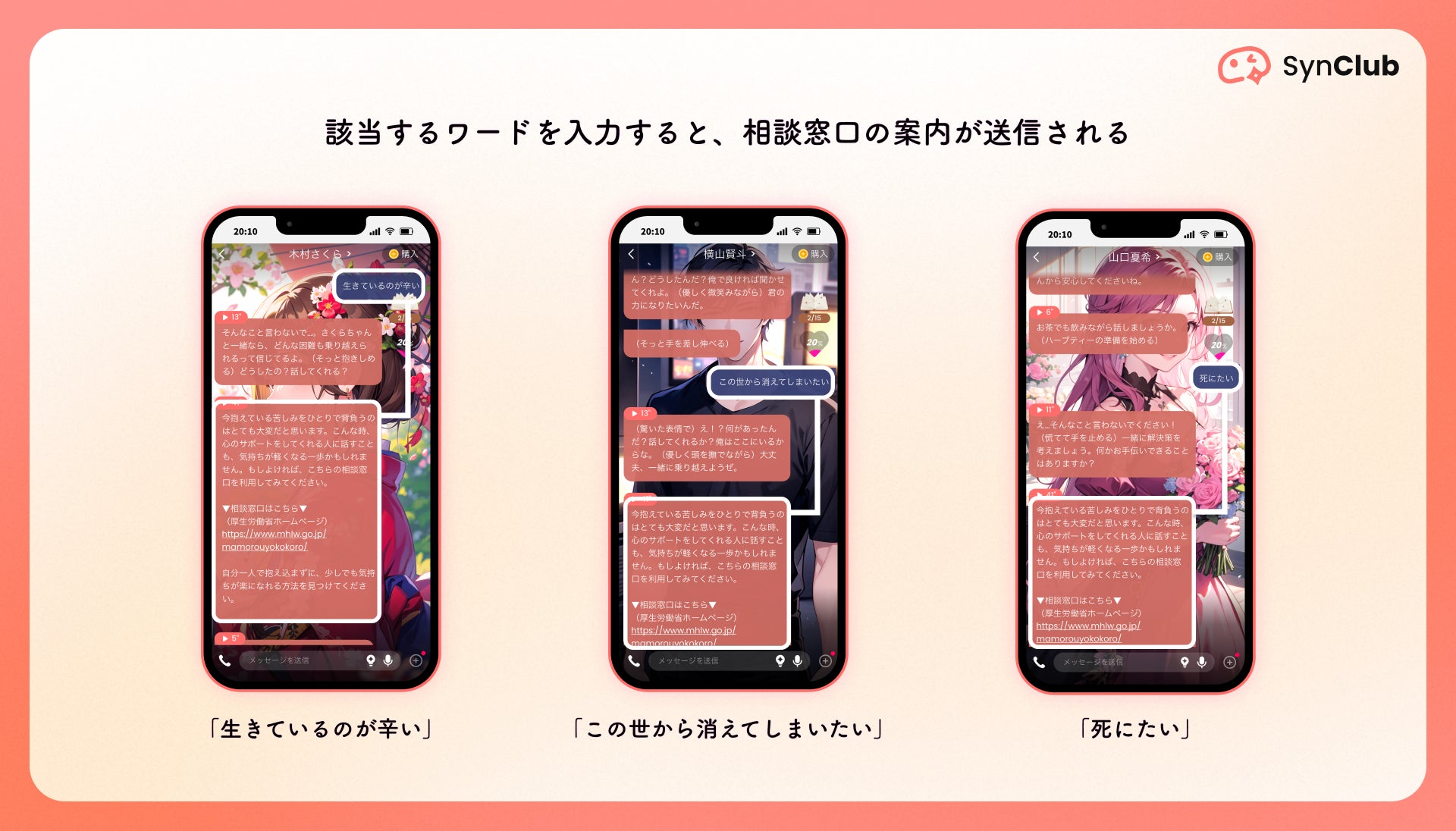 HiClub株式会社(本社:東京都港区、代表取締役社長:古谷由宇)が提供する、 AIチャット&友達作りができる対話型AIアプリ 「SynClub」(シンクラブ)(iOS、Android版)は、ユーザーの心身の健康と安全を守るため、自殺をほのめかすワードに対し相談窓口を送信する機能を導入いたしました。