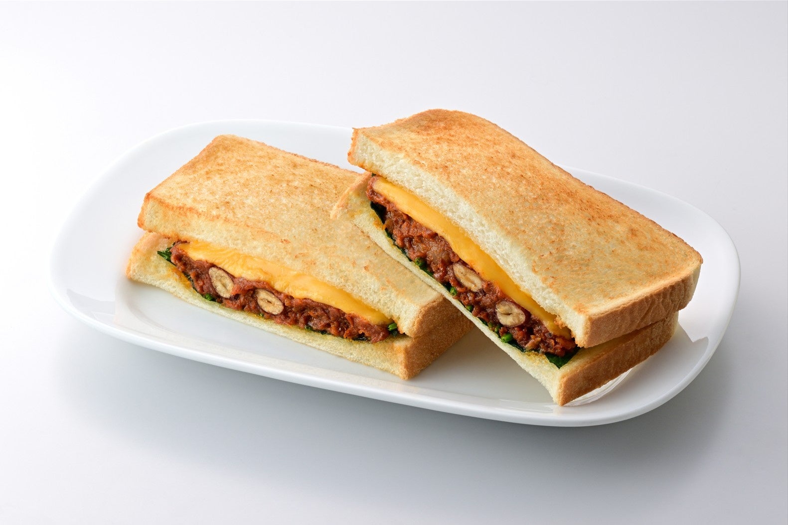 3種類の豆(レッドキドニー、ガルバンゾ、レンズ豆)を旨辛チリソースで味付けしたフィリングをパンにたっぷりと挟み焼き上げることで、香ばしさと食べごたえをプラス。チェダーチーズのコクとまろやかさがとろりと溶け合い、スパイシーな味わいを優しく包み込みます。スパイスの刺激と豆のほくほく感、チーズのなめらかさが絡み合うトーストサンドです。