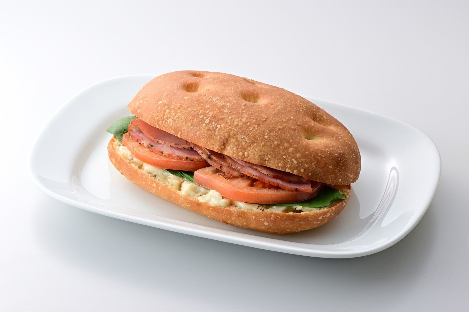 オリーブオイルを練り込んだしっとりもちもち食感のフォカッチャに、コクのあるシーザーサラダ風味のフィリングをサンド。そこに、ピリッと黒コショウが効いたパストラミポーク、みずみずしいトマト、サラダほうれん草を重ね、シンプルながら素材の美味しさを最大限に引き出しました。ひと口頬張れば、フォカッチャの香ばしい風味と具材のハーモニーが広がり、心満たされる一品です。