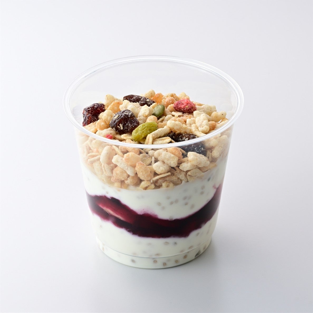 濃厚なヨーグルトに、ぷるぷる食感のチアシードを合わせ、グラノーラとドライフルーツで食感のアクセントを加えた贅沢な一品です。チアシードは、植物「チア」の種で、オメガ3脂肪酸を豊富に含むスーパーフード。酸味と甘みのバランスが絶妙なフルーツソースが絡み、濃厚で満足感ある一品に仕上げました。