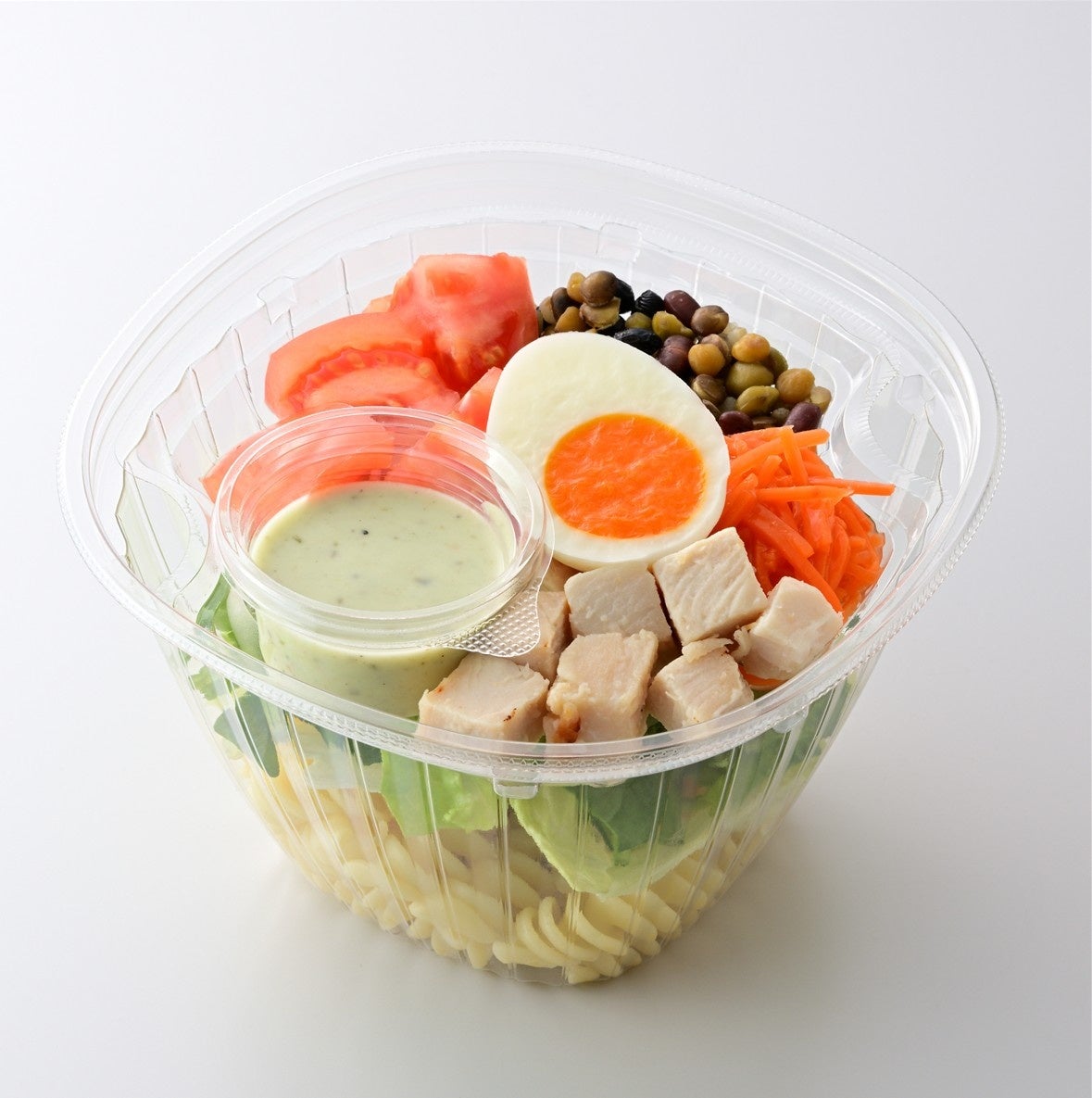 シーザーサラダパスタは、バジルの風味が効いたスモークパルメザン入りのドレッシングがアクセント。しっとりとしたチキンやゆで卵、雑穀などが入っており、たんぱく質をたっぷり摂れる一品です。