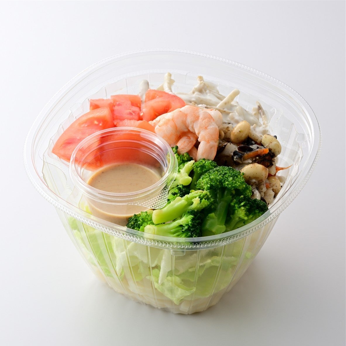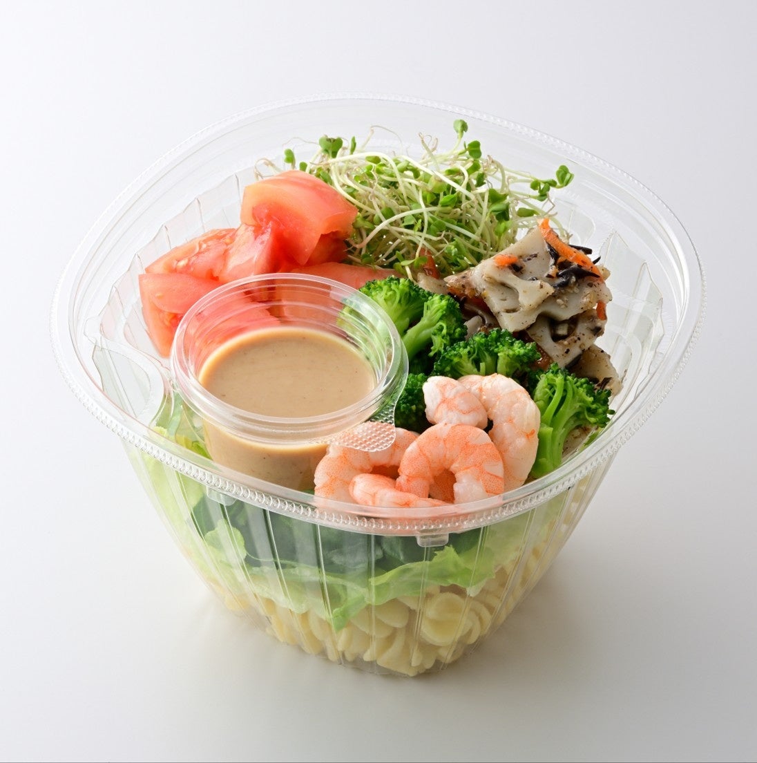 えびのサラダパスタには、海老、ほうれん草、トマト、ブロッコリー、ひじき、れんこん、さらにスーパーフードのひとつであるブロッコリースプラウトがたっぷり入っています。胡麻ドレッシングにわさび醤油をアクセントとして加え、味わいに深みを持たせました。