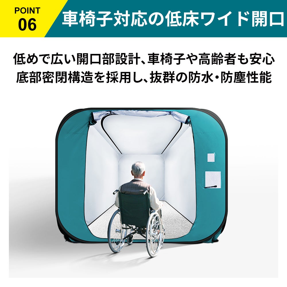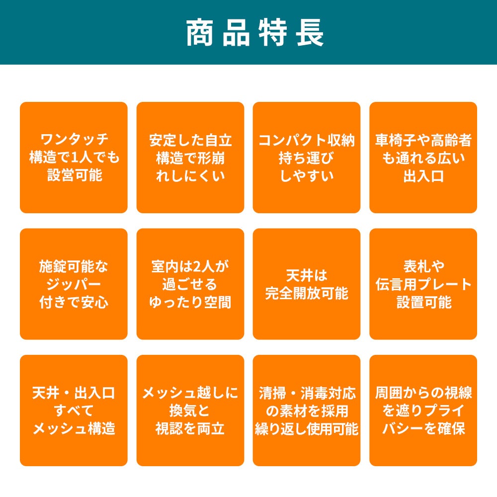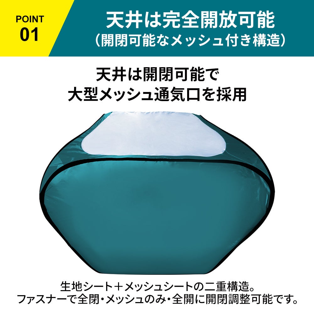 天井・床・側面、すべてを一体化した密閉構造。天井は開閉可能な二重構造で、通気性にも優れます。避難所におけるプライバシーの確保と、衛生・快適性の両立を実現します。