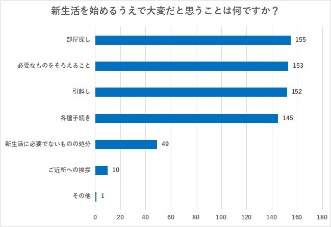 今回「新生活を始めるうえで大変だと思うことは何ですか?」というアンケートに回答いただいたところ、お部屋探しや引っ越しと並んでやはり「必要なものをそろえること」を大変だと感じている方が多いようです。