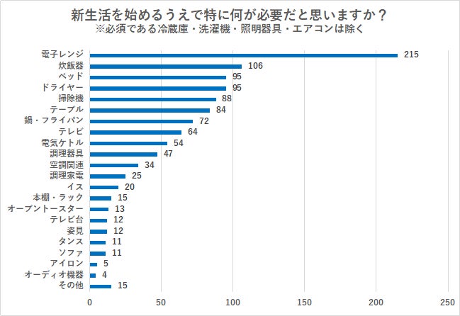 今回、新生活には必須である「冷蔵庫」「洗濯機」「照明器具」「エアコン」を除いて、特に何が必要なのかを下記でランキング形式にまとめました。