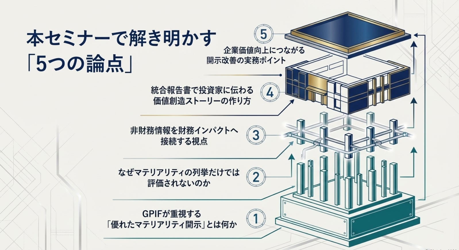 2026年3月公表のGPIFレポートをもとに、投資家が評価するマテリアリティ開示の要諦を解説するセミナーを開催します。非財務を財務・企業価値へつなぐ視点を共有。