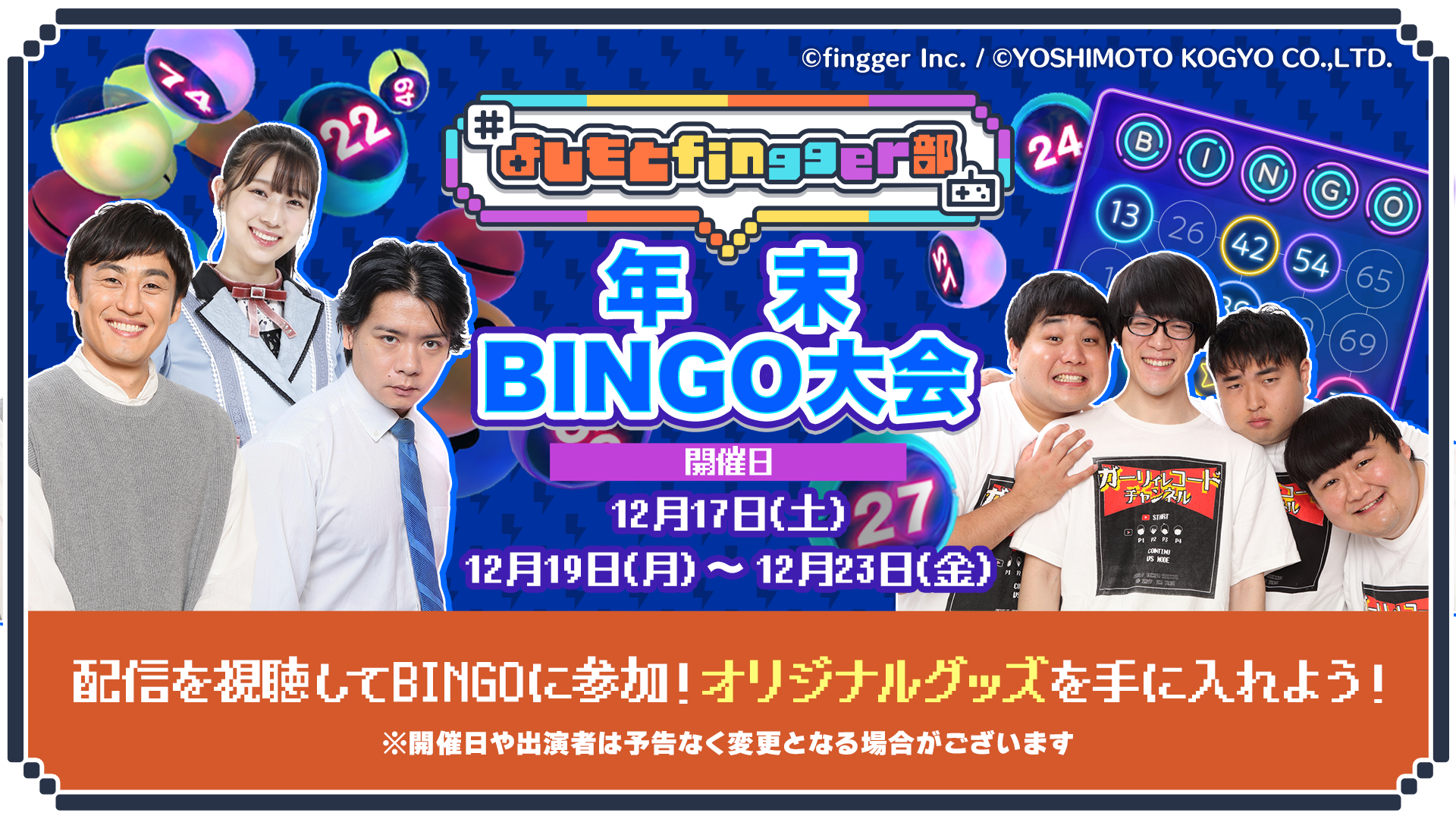 12月17日(土)から12月23日(金)の期間、『よしもとfingger部』の配信内で、豪華賞品が当たる『よしもとfingger部 年末BINGO大会』を開催いたします。