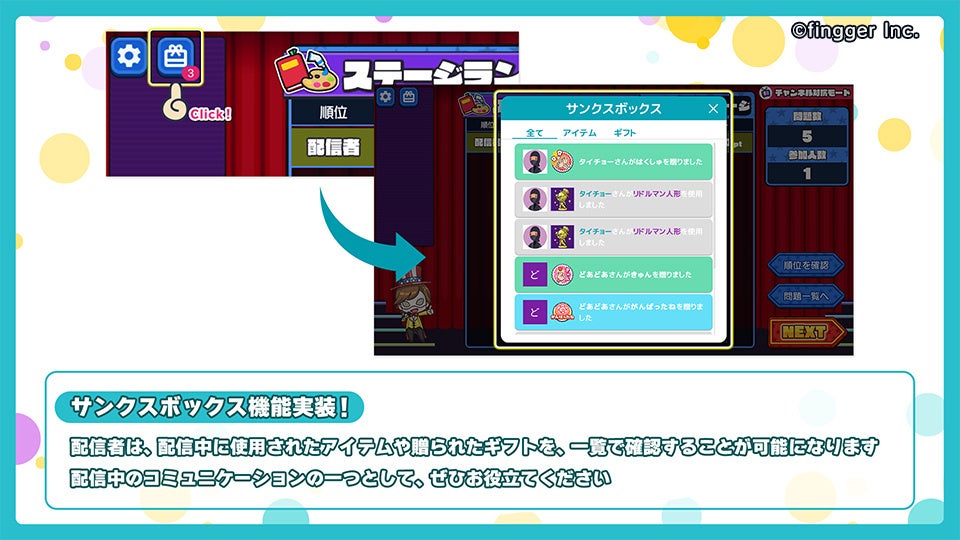 配信者は、配信中に使用されたアイテムや贈られたギフトを、一覧で確認することが一部のゲームコンテンツで可能になります。