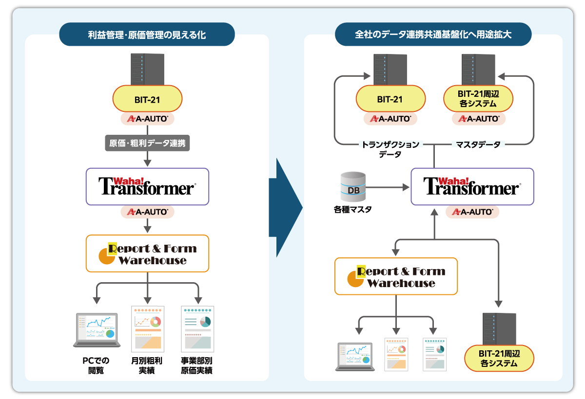 現在では、「利益管理・原価管理の見える化」や「全社のデータ連携共通基盤」など、さまざまな業務で「Waha! Transformer」と「Report & Form Warehouse」をご活用いただいています。