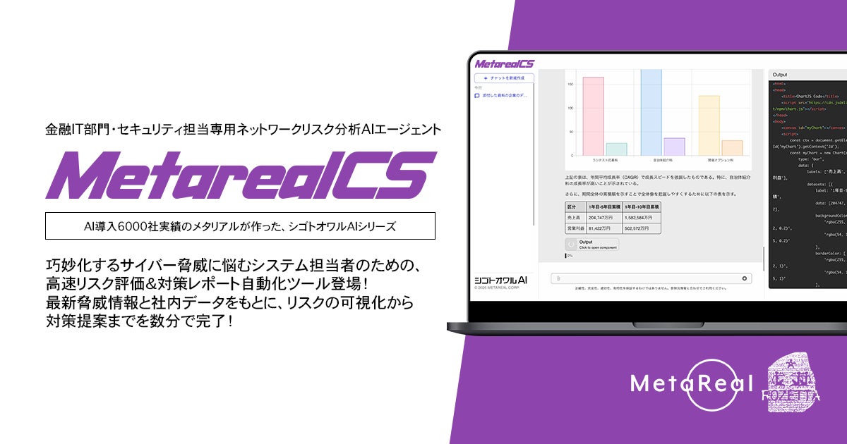 業種特化の専門AI開発・運営を行う株式会社メタリアル(本社:東京都千代田区、代表取締役:五石順一)は、ネットワークリスク評価・サイバー対策レポート作成AIエージェント「Metareal サイバーセキュリティ」(以下、Metareal CS)を6月3日(火)に新開発・提供開始したことを発表します。