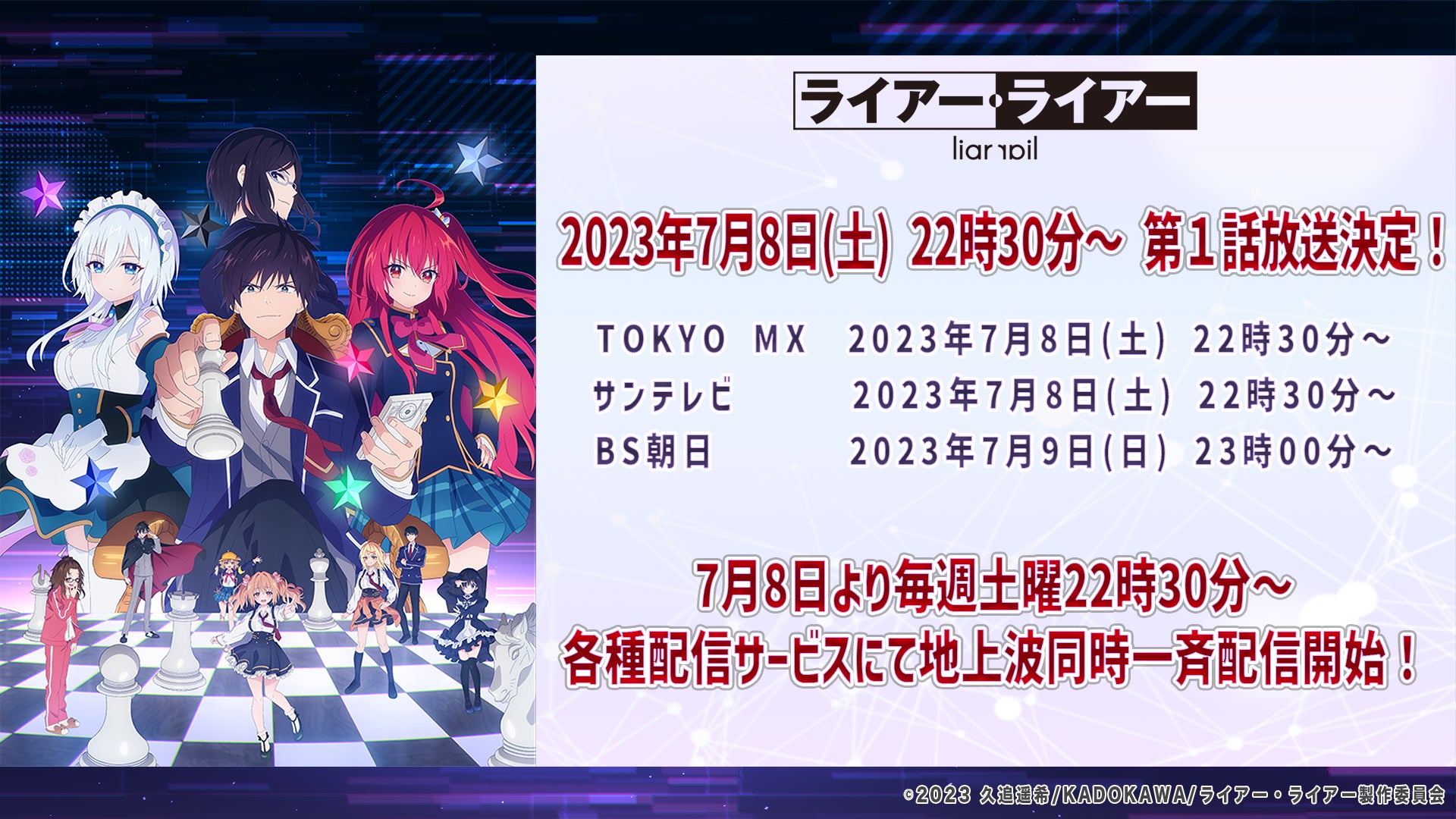 株式会社サイバーエージェント(本社:東京都渋谷区、代表取締役:藤田晋、東証プライム市場:証券コード4751)は、KADOKAWAのライトノベルレーベル「MF文庫J」より大人気刊行中の、絶対に負けられない学園頭脳ゲーム&ラブコメ原作TVアニメ『ライアー・ライアー』が2023年7月8日(土)22時30分よりTOKYO MX、サンテレビにて放送開始が決定したことをお知らせいたします。BS朝日では2023年7月9日(日)23時00分より放送が決定いたしました。