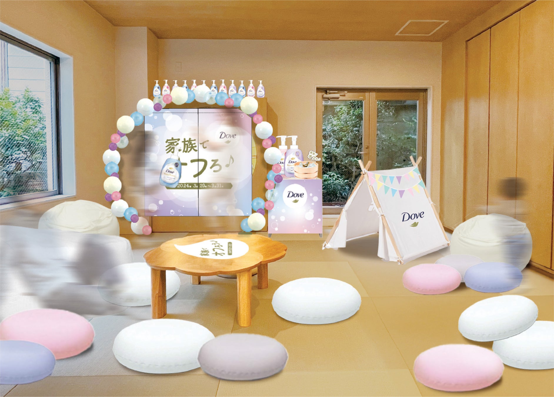 銭湯の待合スペースにはダヴの泡をイメージしたクッションや、今回のコラボレーションをモチーフにしたフォトスポットが登場。親子で使えるダヴのボディウォッシュの雰囲気を感じられる内観に様変わりします。