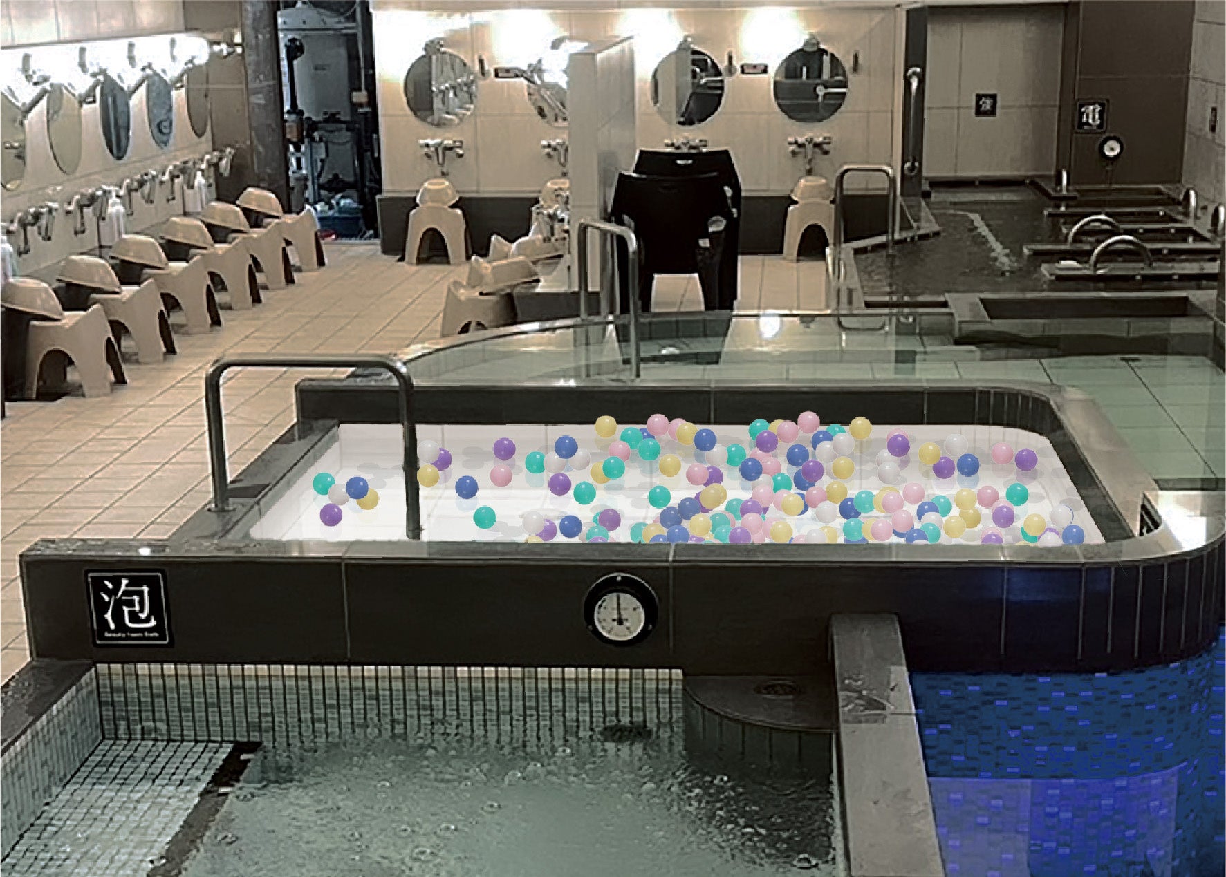 更衣室を通り銭湯内に進むと、ダヴの泡をイメージしたコラボレーション風呂“真珠肌の湯”をお楽しみいただけます。浴槽には泡をモチーフにしたボールも浮かび、お子様とご一緒にゆっくりとお風呂時間を楽しんでいただくのにもぴったりの遊び心あふれるお風呂になっています。