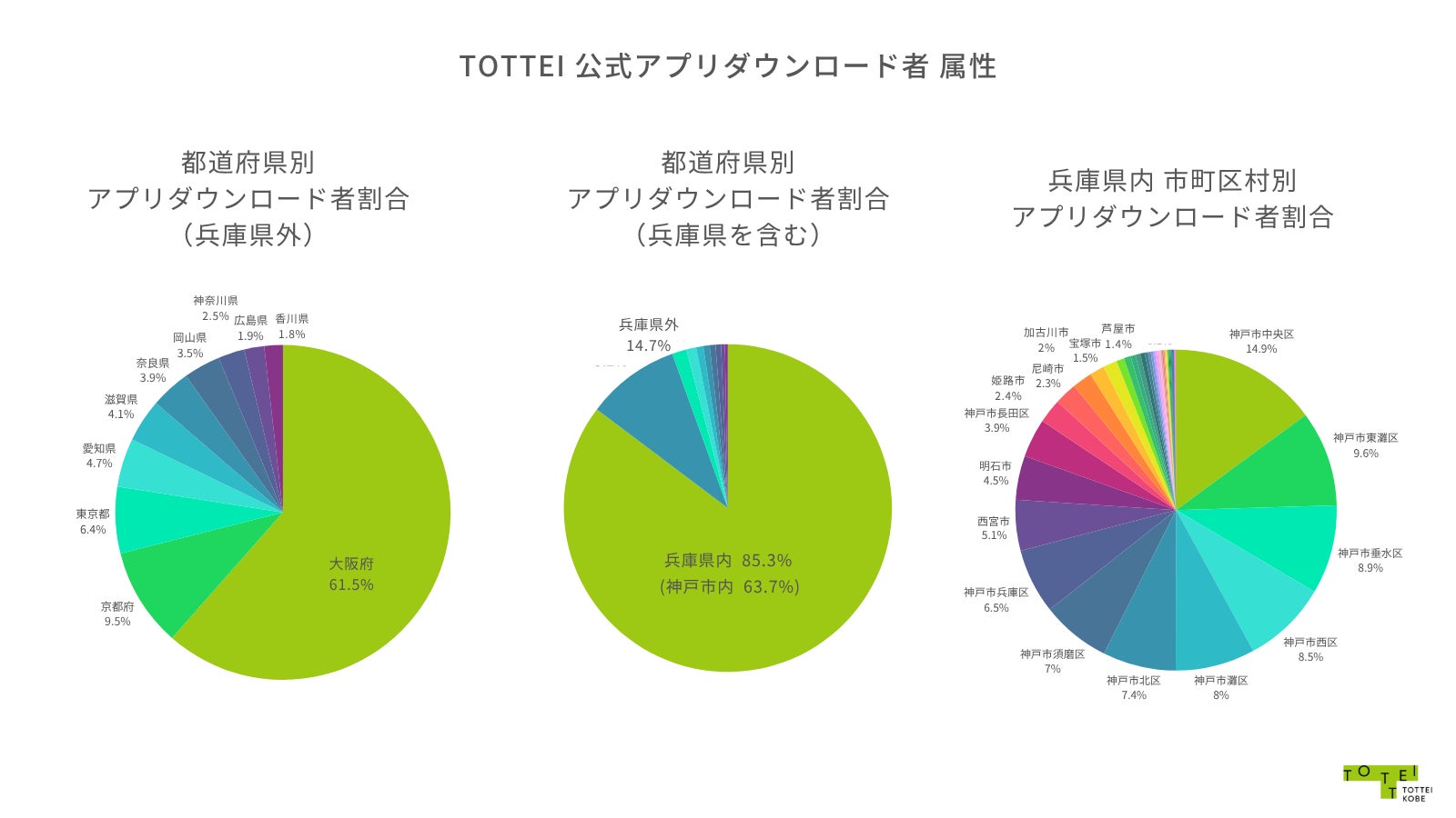TOTTEI公式アプリダウンロード者のうち63.7%が神戸市内在住者、14.7%は兵庫県外在住者です。県外在住者のうち、約8割は関西在住者で、東京都や愛知県など関西以外の在住者にもご利用いただいています。