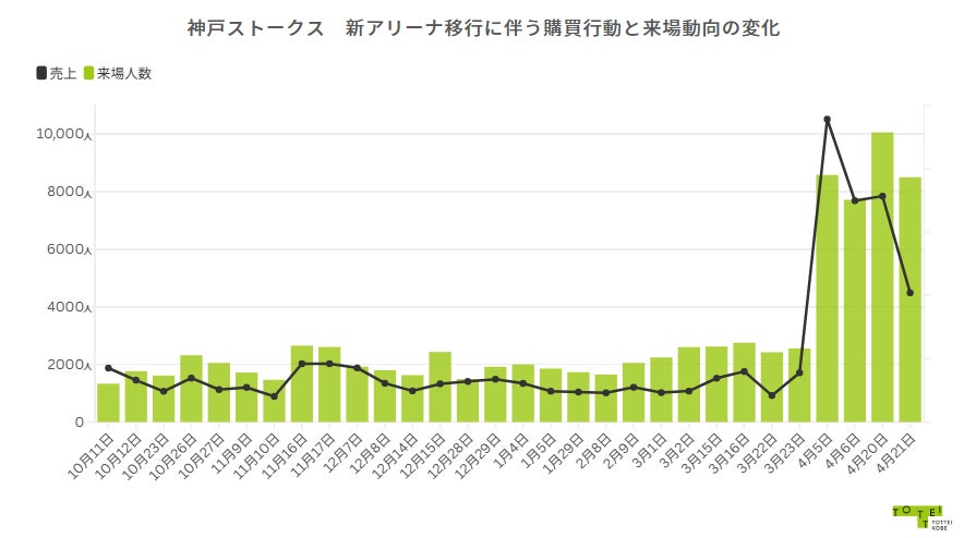 アリーナイベント開催日には来場者数に比例する形でTOTTEI内の購買金額や利用回数が増加。中でも神戸ストークス興行時は他の興行に比べて、約2倍の購買活動が行われ、クラブの勢いを感じる結果となりました。