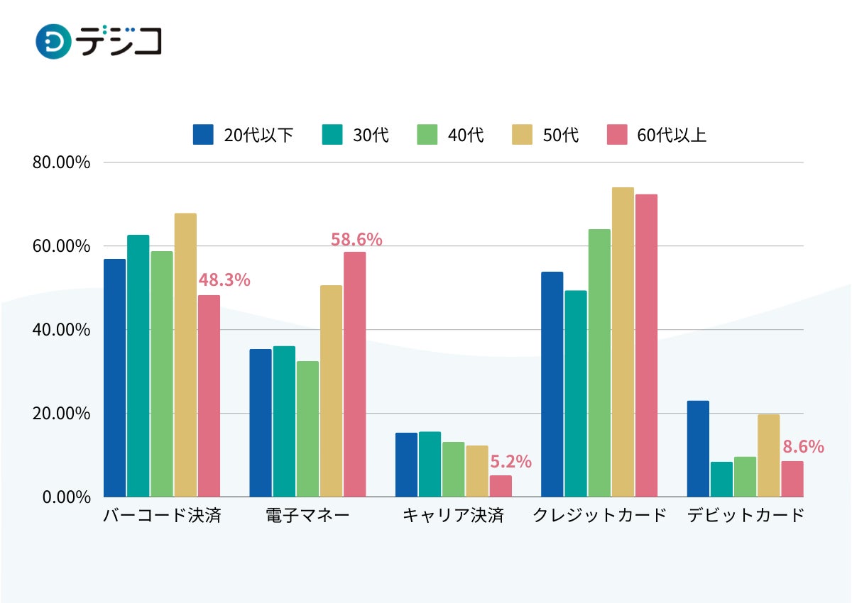 ・シニア層は、「電子マネー」の利用経験率が58.6%と全世代で最も高かった