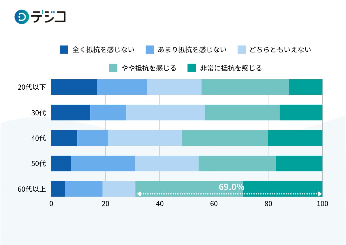 現金を持たずに外出することに抵抗を感じるか聞いたところ、世代が下がるにつれ「全く抵抗を感じない」割合が高く、世代が上がるにつれ「非常に抵抗を感じる」割合が高い傾向にあることが分かりました。また、シニア層の約7割が現金を持たずに外出することに「抵抗を感じる」と回答しました。