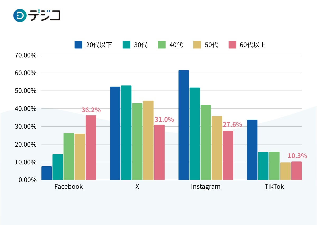 普段利用しているSNSについて聞いたところ、「Instagram」と「TikTok」に関しては年代が下がるにつれて利用している割合が高い一方で、「Facebook」に関しては他世代に比べてシニア層の利用率が36.2%と圧倒的に高く、またシニア層が最も利用しているSNSは「Facebook」であることが分かりました。