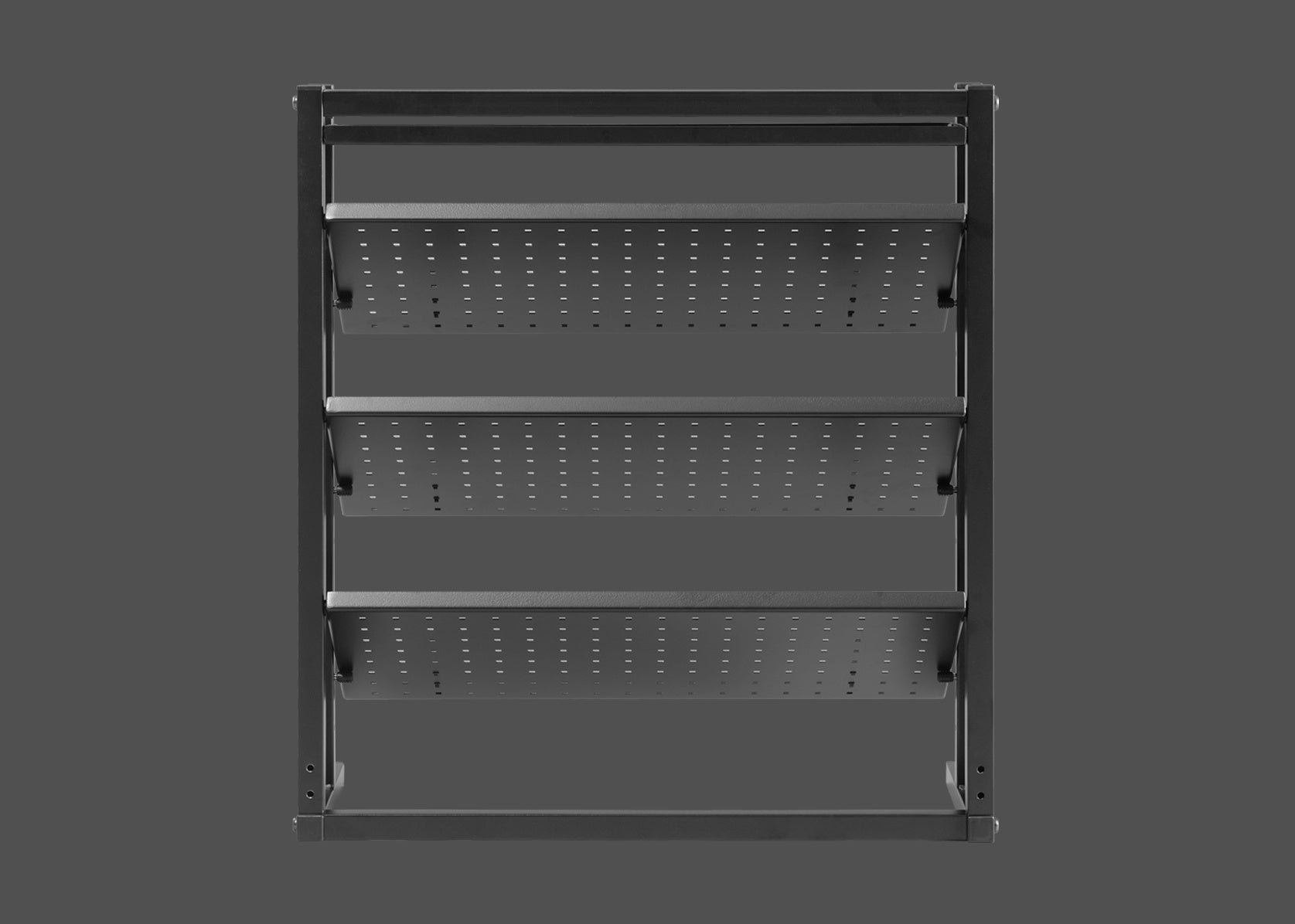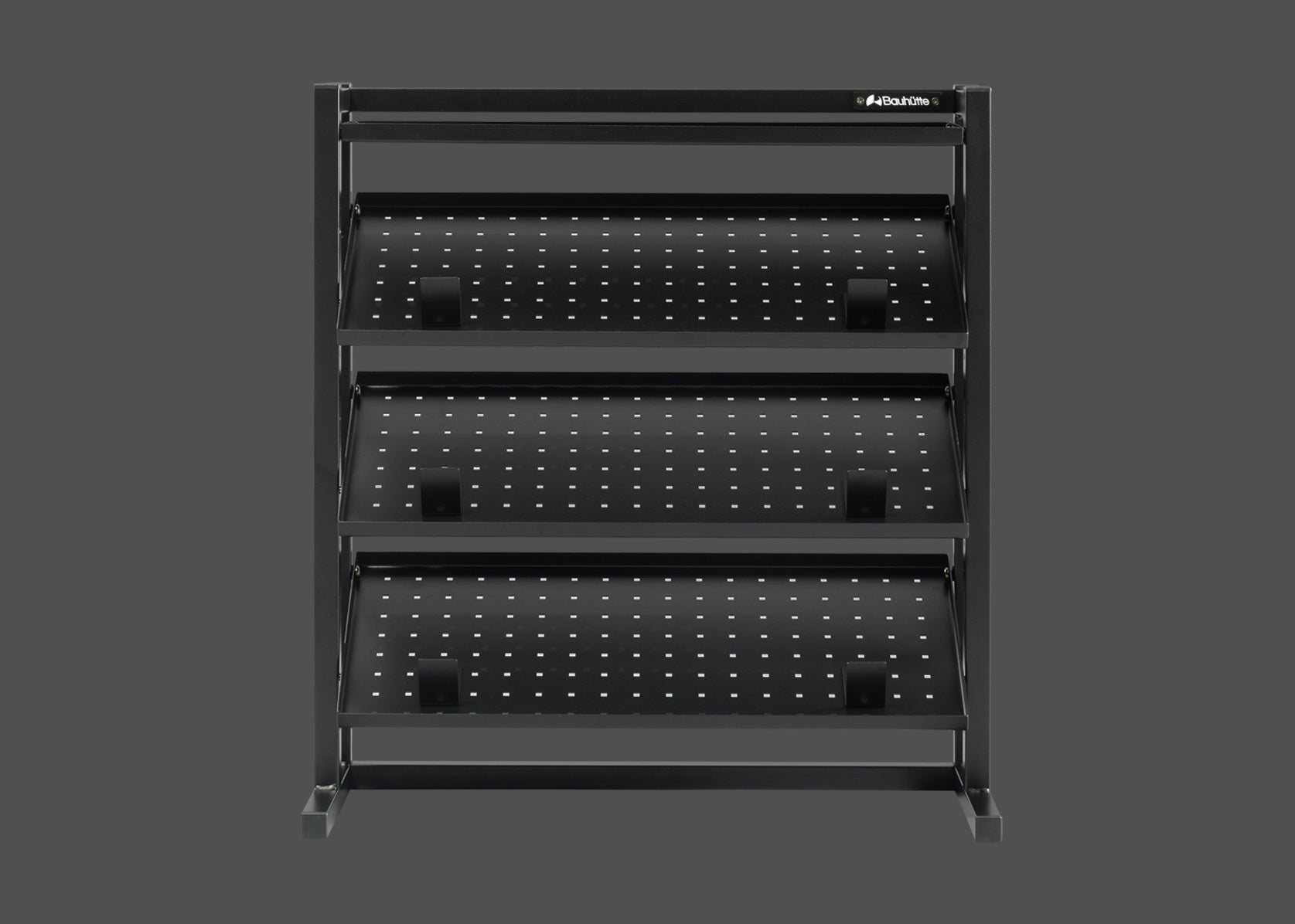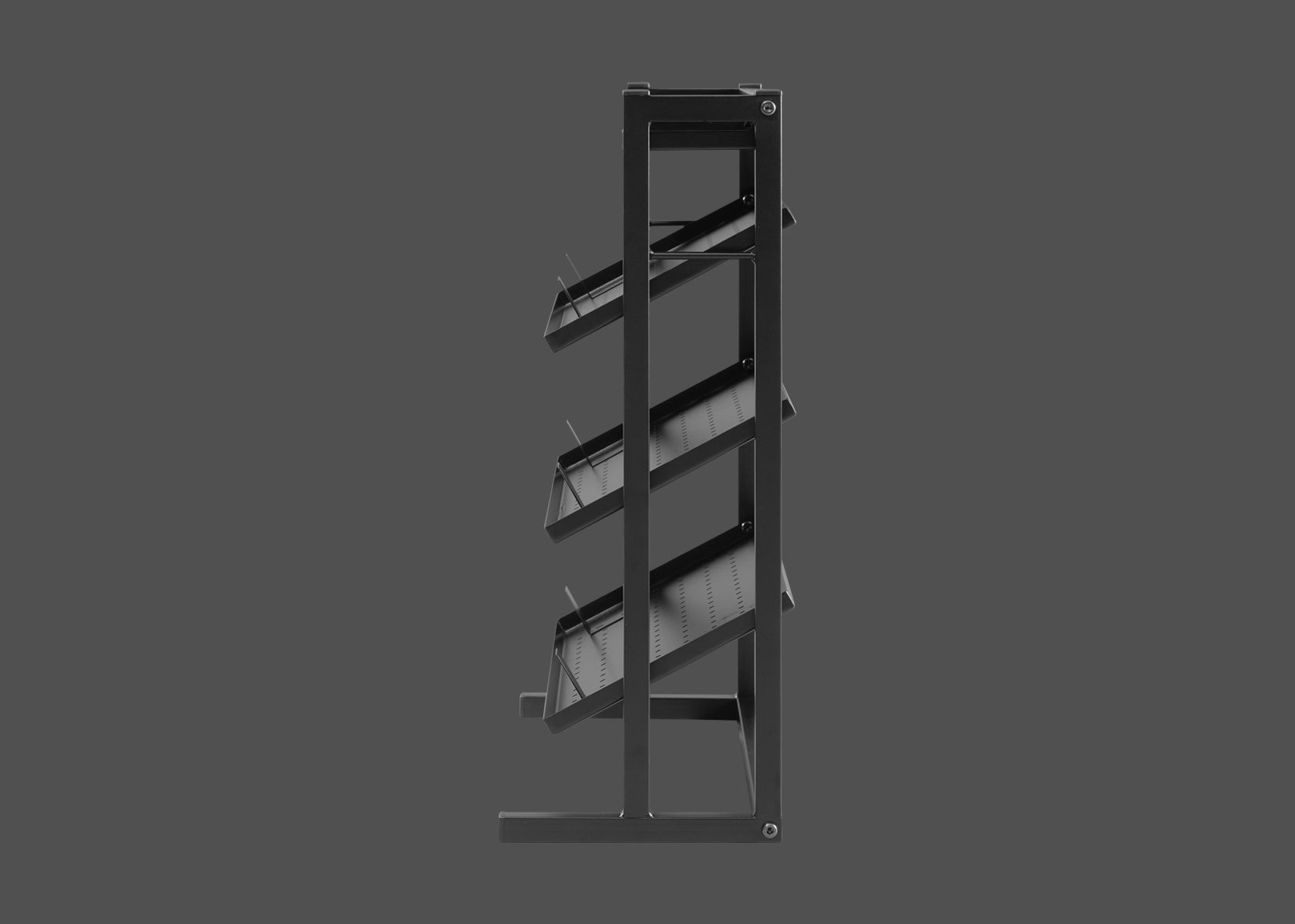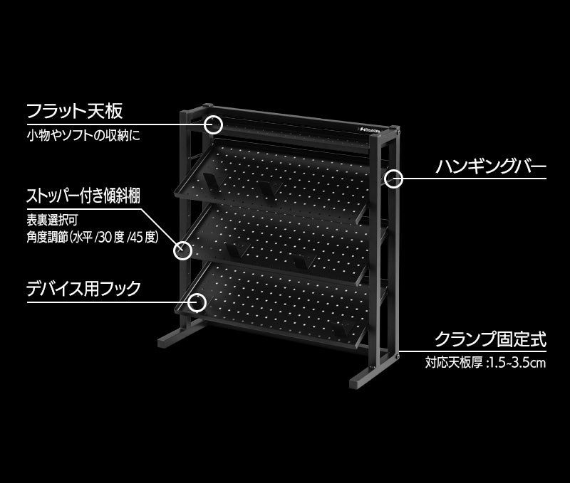 本製品は、3段の傾斜棚を備えた省スペースな卓上ラックです。デバイスの“魅せ方”にこだわりながらも、配線管理やアクセス性といった実用面を犠牲にしない設計を追求しました。棚の角度調節や専用フックなどのカスタマイズ性にも工夫を凝らし、思い通りのレイアウトを実現可能。ガジェット沼へのハマりを加速させる一台となるよう、各部へ工夫を凝らしています。