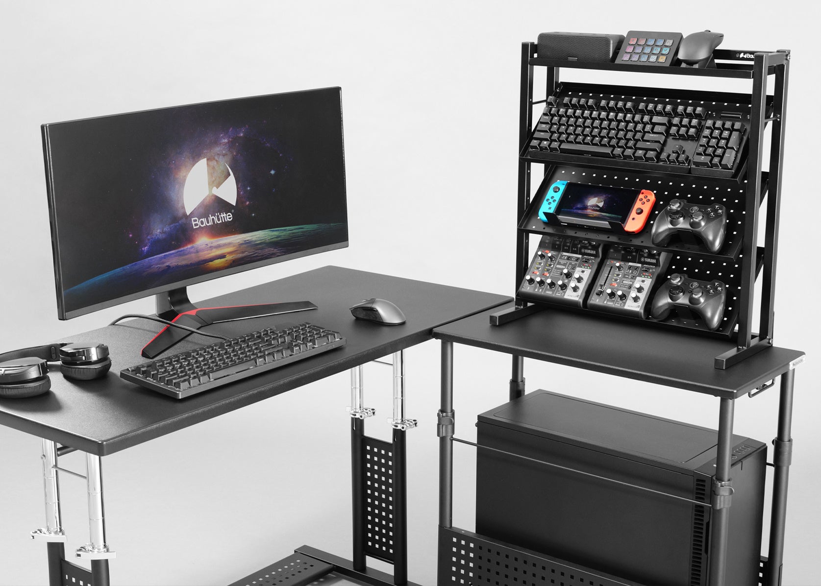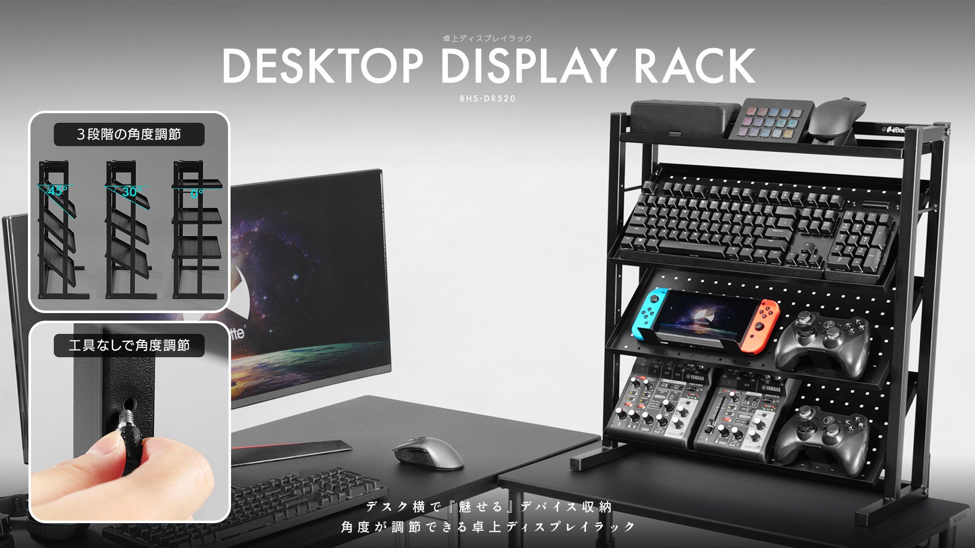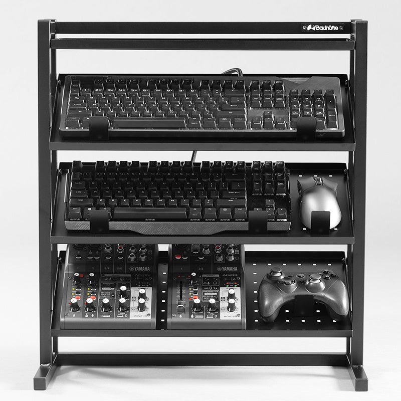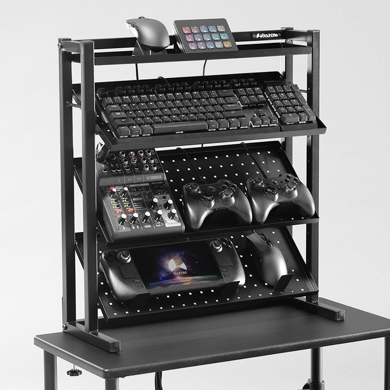 お気に入りのキーボードやマウス、オーディオインターフェースにコントローラー……ガジェット好きなら、ひとつひとつに“選んだ理由”と“語れるこだわり”があるはず。その一方で卓上のスペースには限りがあるため、収納場所に仕舞い込むか、隅の方へ追いやらざるを得ない…という問題にも直面しがちです。手に取って使うものだからこそ「いつでも目に入り、サッと手に取れる位置で美しくディスプレイしたい!」と願う人は多いはず。そんなガジェット愛好家たちの理想を叶えるべく、愛用デバイスの『魅せる収納』に特化した専用ラックを開発しました。