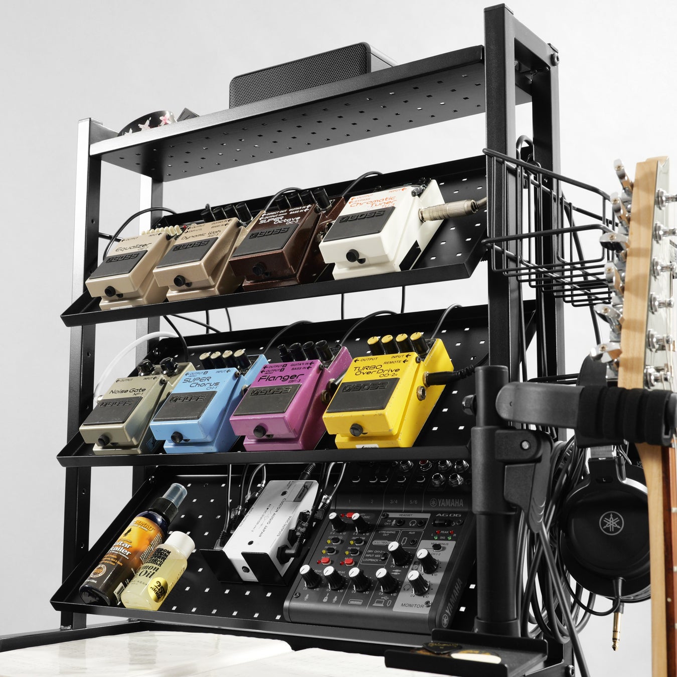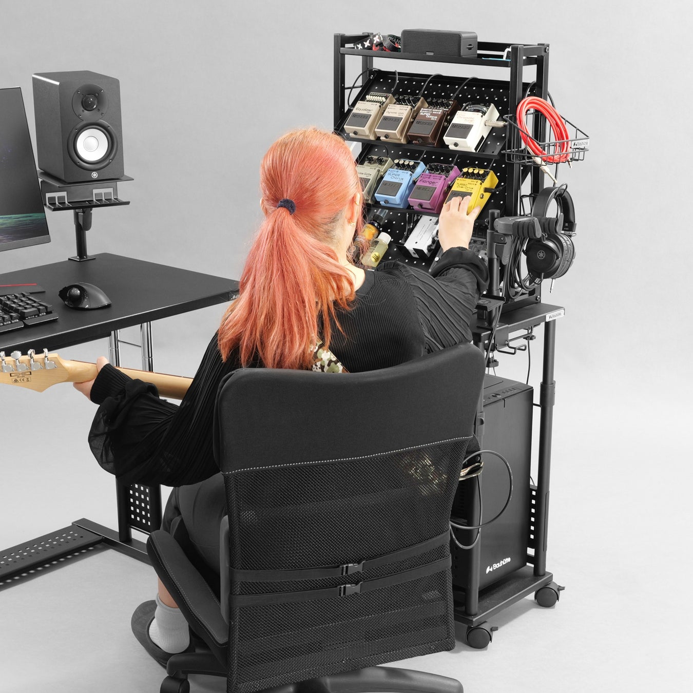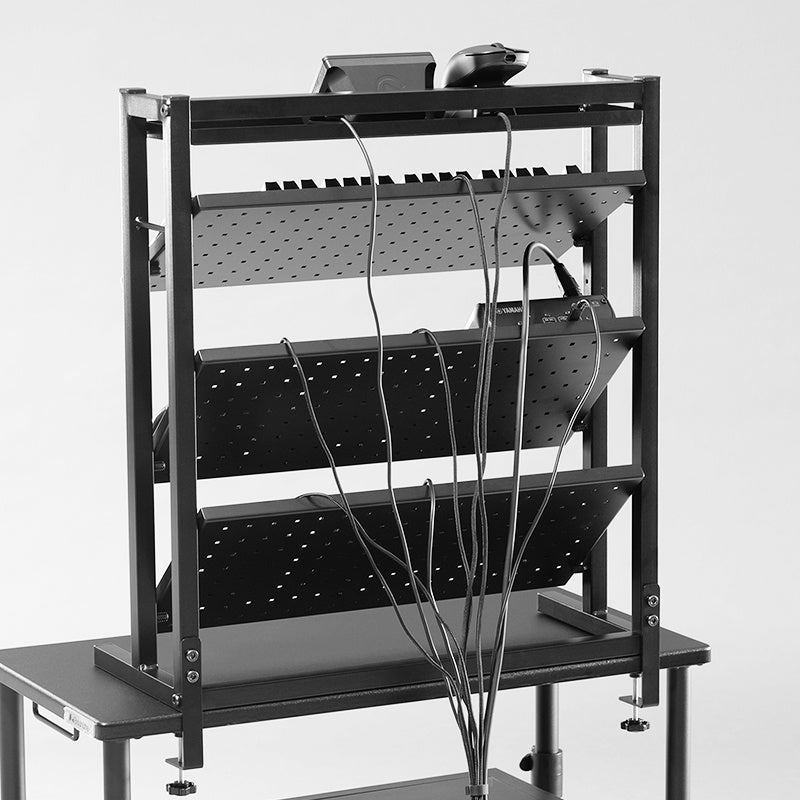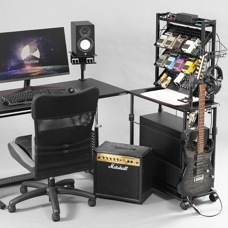 オーディオインターフェースやMIDIコントローラー、ギターエフェクターなど、細かな機材が多くなりがちなDTM環境。本製品は、限られたデスク上の作業スペースを確保しながら、機材の視認性・操作性を両立できる設計です。制作の流れを妨げない、快適な環境づくりをサポートします。