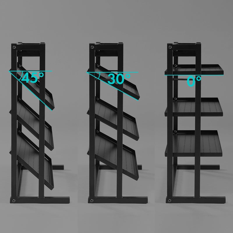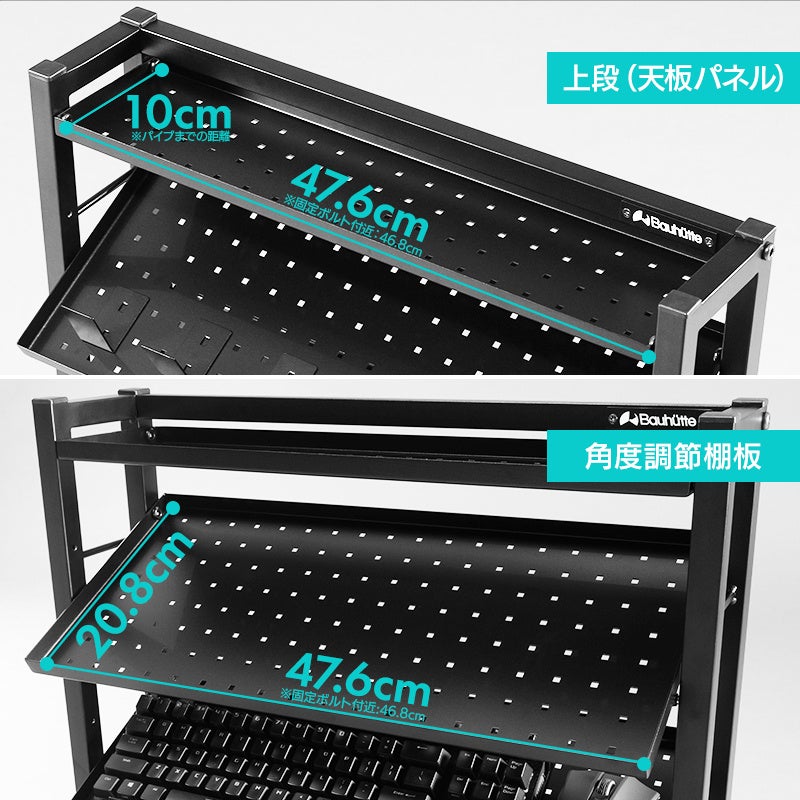 お気に入りのデバイスたちを、ただ並べるだけじゃなく“魅せて置ける”3段の傾斜棚構造。棚板は水平/30度/45度で角度を調節でき、デバイスの形や並べ方に合わせて、見やすさ・取りやすさを自分好みにカスタムできます。工具不要のダボ式なので、設置後の変更もカンタン。ゲーミングやDTMでよく使うフルサイズキーボードもピッタリ収まる「ちょうどいい」サイズ感に仕上げました。