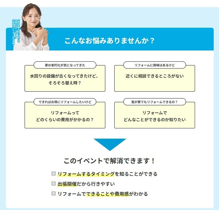主人には内緒だったけど、まずは私一人でイベントに参加してみました。チラシを見て、最近のキッチンやお風呂はどんなのか見てみたいなと思って。色々な商品があったけど親切に説明してくださってよくわかりました。まだリフォームするかどうかも分からない私にも親身に教えて嬉しかったです。帰って主人に話して、もう一度一緒に来てもらおうと思いました。