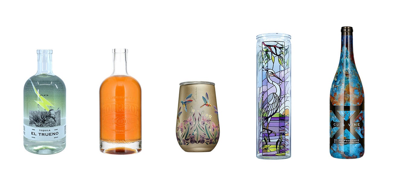 PeriVallo360mは、ユニークで革新的な輪郭追従プリントテクノロジーによる柔軟な形状対応力が大きな特長の製品です。通常のダイレクト印刷では難しい、さまざまな曲面や先細り形状への加飾、例えば、ワインボトル上部の首~肩にかけた窪んだ部分などにも、一度でボトル全体に印刷を施すことが可能に。プレミアム感の高いパッケージや瓶などのカスタム製作に力を発揮します。