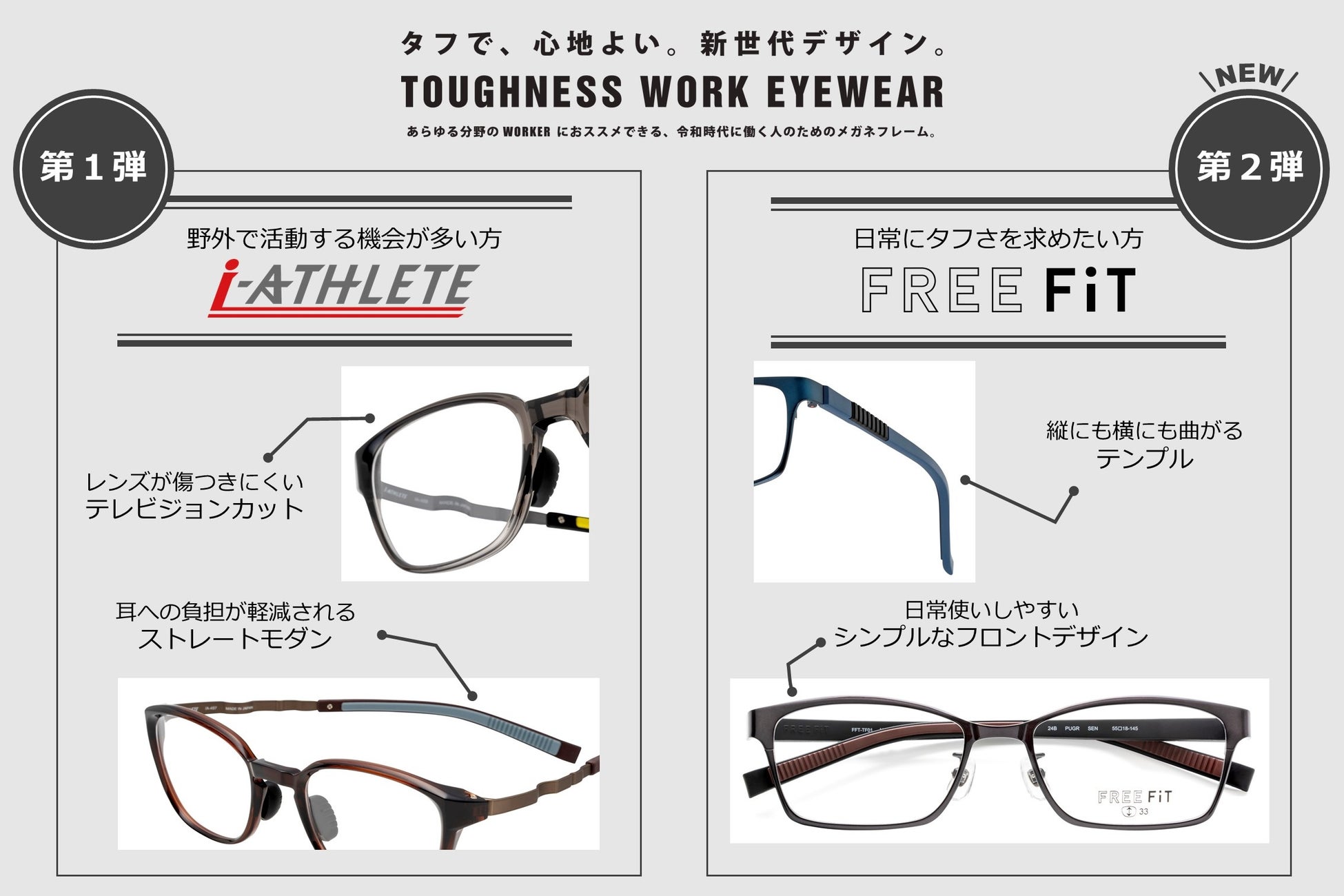 眼鏡データベース2023(眼鏡光学出版株式会社)の「今までに購入したメガネに対して「不満」と感じた具体的内容」のアンケートにて、フレーム・レンズの品質について一番多かった回答は「ずり落ちやすい」21.2%でした。この結果をもとに、激しい動きでもずれ落ちにくい「タフシリーズ」の開発がスタート。第一弾は野外で活動する方へ向けた「i-ATHELETE」を展開。第二弾となる今回は、室内で活動する機会が多い方に向け、FREE FiTの軽くてかけやすい機能性はそのままに、既存より3倍高い耐久性の新作モデルが登場しました。
