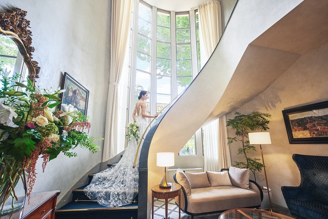 2Fへと続く曲線が優美な螺旋階段はレトロな雰囲気の赤い絨毯から、リニューアル後の壁紙や空間に合わせて紺色の絨毯に。白いウエディングドレスが映える、「リストランテASO」の中でも一番のフォトスポットです。
