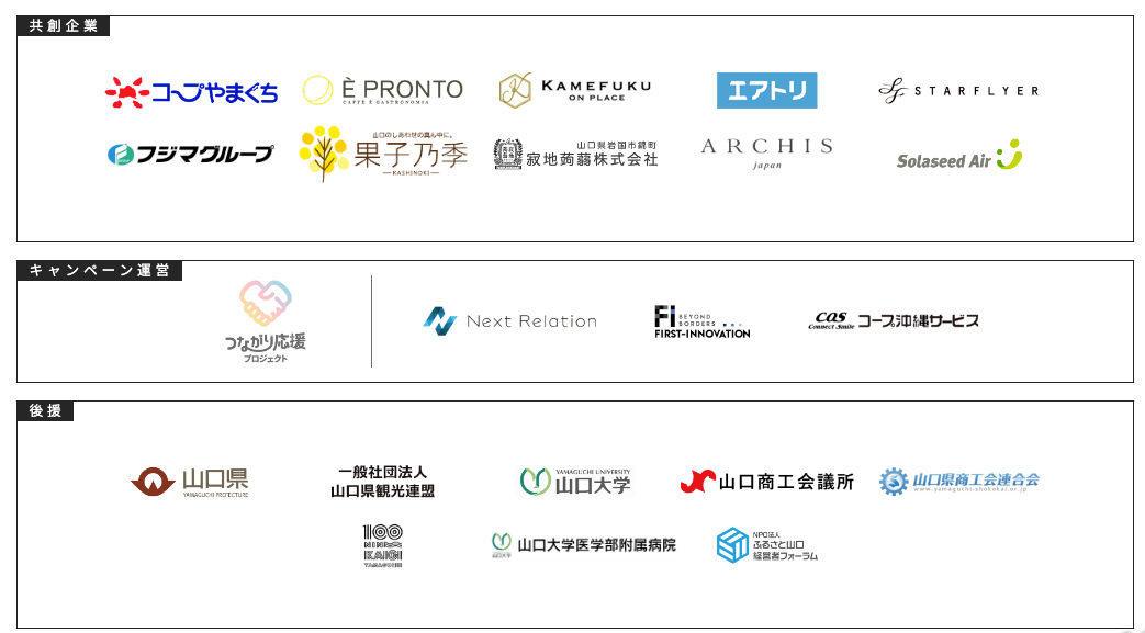 ここに、地元の有志の方々をはじめ、共創企業・協賛企業・アンバサダーの皆様との "つながり連携" で日本全国へ、山口県の魅力を発信する事で観光PRを実現し、子ども支援団体、高齢者支援団体、障害者支援団体への寄付活動を通して、一助となる取組みを行ってまいります。
