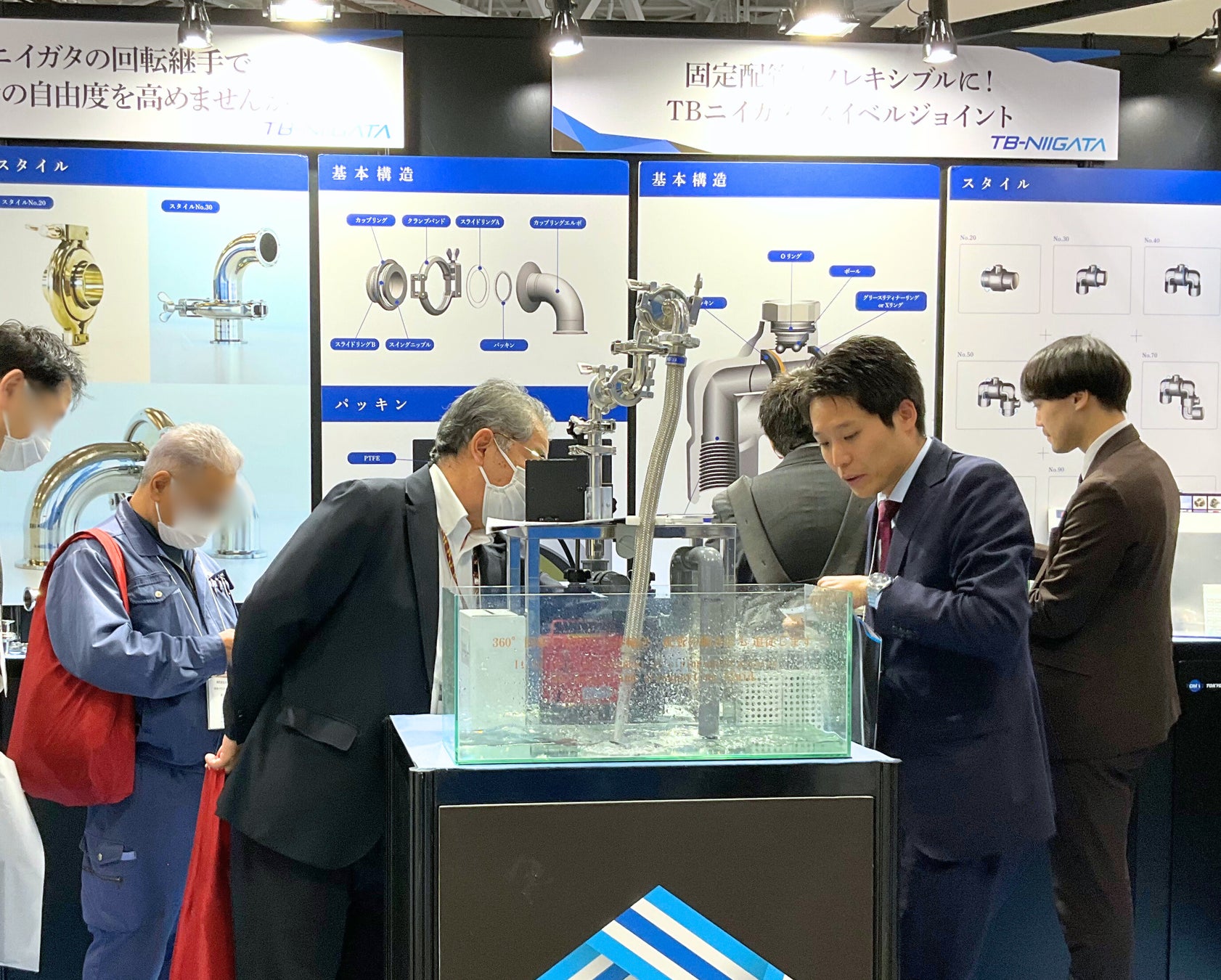TBGブース(小間番号:1-24)では、大手食品工場にて多数採用いただいているサニタリースイベルジョイントの現物をご紹介します。また、各種スイベルジョイントのサンプルを展示し、実際に固定配管がフレキシブルに動く様子をご覧いただいたり、組み立てやすさを体感いただけます。過去の展示会にご来場されたお客様からはその柔軟さや簡便さに驚きのお声をいただいております。