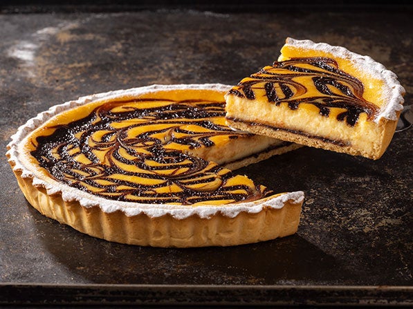 マイルドな酸味のチーズアパレイユにチョコシロップを敷き込み、表面にもチョコシロップでデコレーションして焼き上げました。