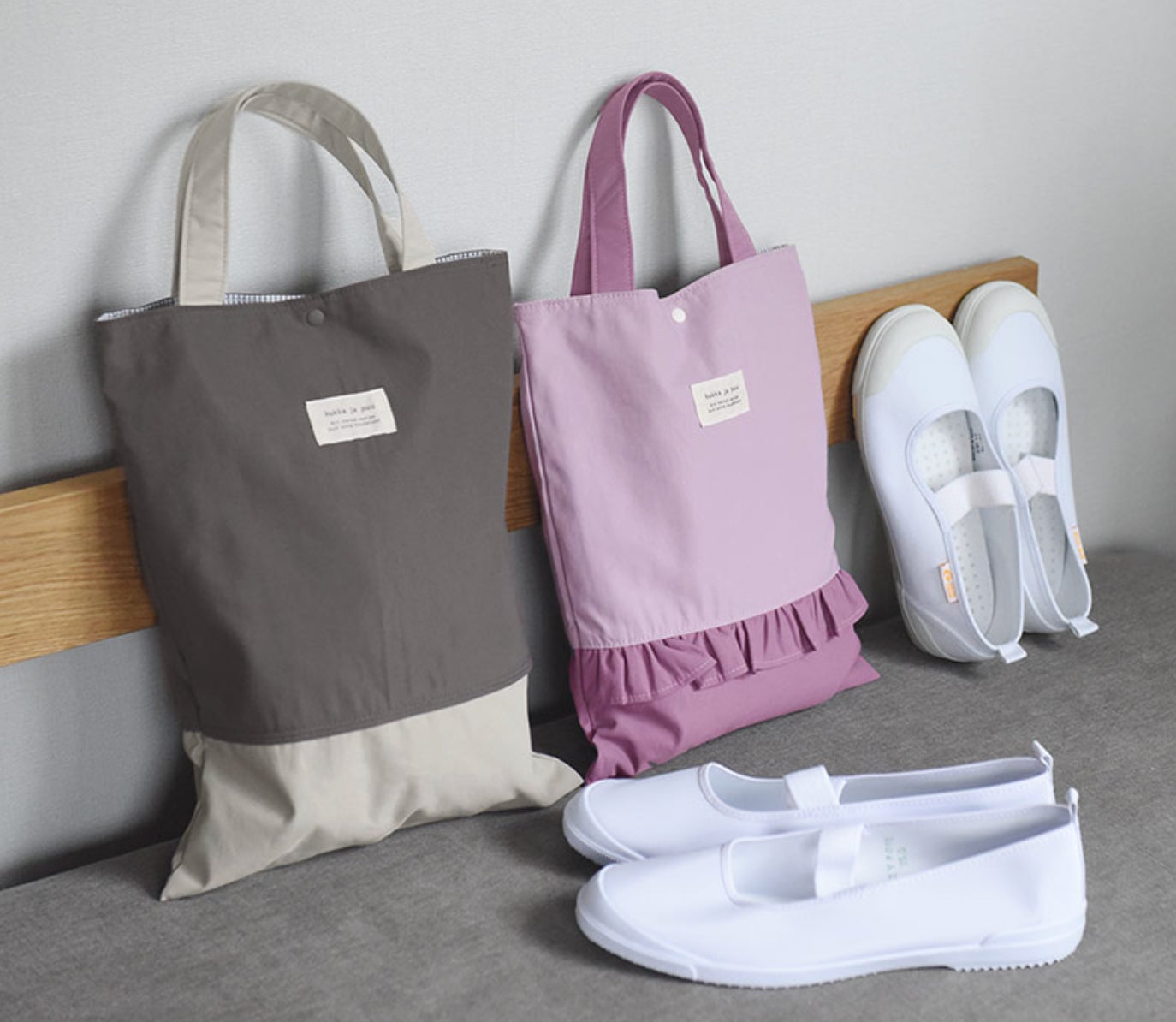 ミニトートのようなデザインで、お子様でも持ち運びやすく、靴の出し入れもしやすい「シューズバッグ」。
