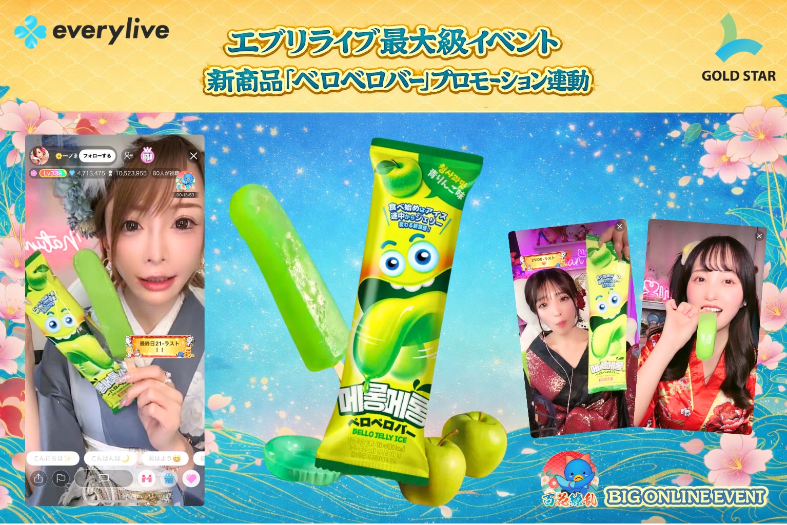 エブリライブ株式会社(本社:東京都港区、代表取締役:影山和義)は、2026年3月27日(金)に開催したライブ配信アプリ「everylive(エブリライブ)」年間最大級イベント「百花繚乱 彩の祝典」において、株式会社Gold Starと連携し、新商品「ベロベロバー」のプロモーション施策を実施いたしました。