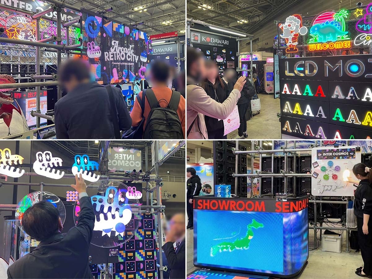 今回の展示会では、Camp.Inc様による企画・デザイン監修のもと、「Arcade RETRO CITY」をテーマに、80年代シティポップを彷彿とさせる世界観と最新デジタル演出を融合。会期中は、遊べる体験型コンテンツや光・映像演出を通じ、多くの来場者の皆さまに新しいエンターテインメント空間をご体感いただきました。