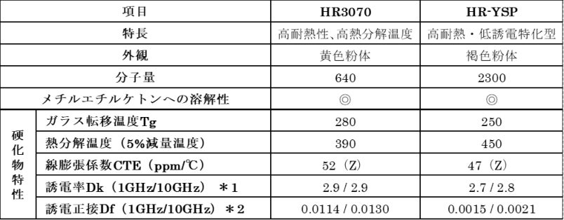 HR樹脂は、高耐熱・低熱膨張係数・低誘電正接・低誘電率という優れた特性を持つマレイミド系樹脂を主成分としながらも、溶剤への溶解度が高いという特長があります。一般的なマレイミド系樹脂は代表的な溶剤であるメチルエチルケトン(MEK)への溶解度が約10%であるのに対して、HR樹脂は分子構造を調整することで溶解度約70%を実現しました。このため、エポキシ樹脂等の他の機能性樹脂と複合化することが容易となり、他の樹脂が持つ長所と組み合わせることで、最新の半導体封止樹脂、パッケージ基板の高い要求仕様に柔軟に対応することができます。