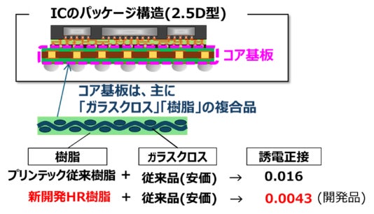 こうした中、マルチチップ化によってデバイスの発熱量が増加するため、ICチップの封止材料においては高耐熱、低熱膨張のニーズが高まっています。また、ICチップを搭載する配線基板(コア基板)の絶縁材料においてもICチップ間の信号処理の高速化、及び高周波通信などが進むことで信号損失への対応が必要となっており、低誘電正接、低誘電率が求められています。