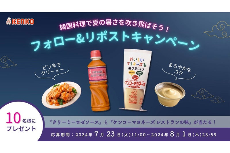 ケンコーマヨネーズ株式会社(東京本社:東京都杉並区、代表取締役社長:島本 国一、以下「当社」)は、当社公式X(@kenko_mayo)をフォロー&リポストすると、韓国料理に使えるソースとマヨネーズが当たるキャンペーンを本日7月23日(火)から8月1日(木)まで実施します。